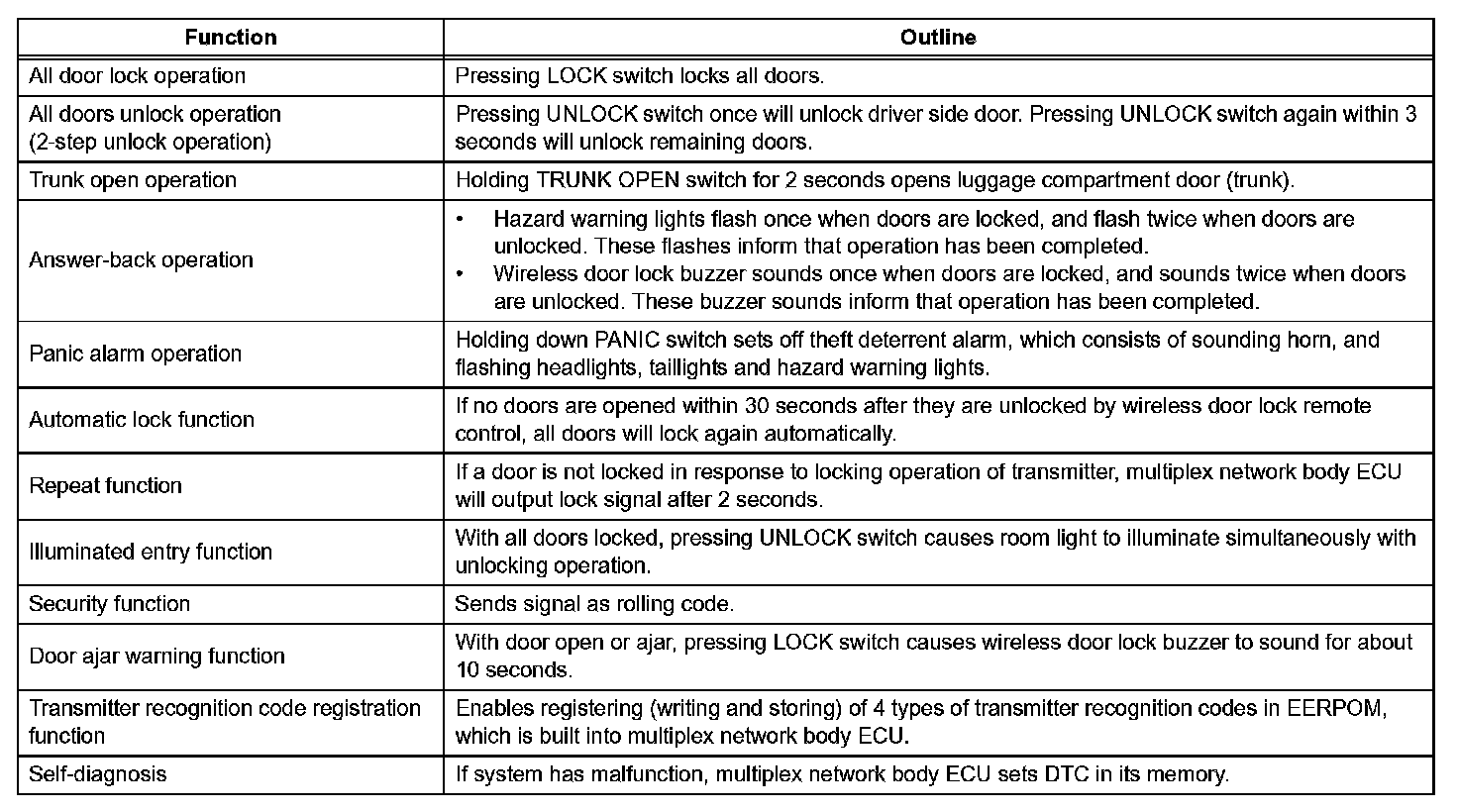 - A key-holder type transmitter is used and it contains the following 4 switches: the door lock switch, door unlock switch, trunk open switch and panic switch.