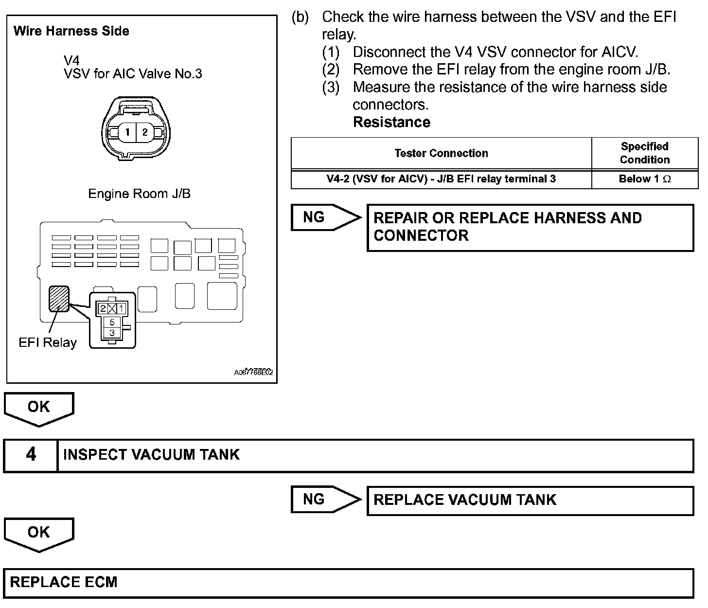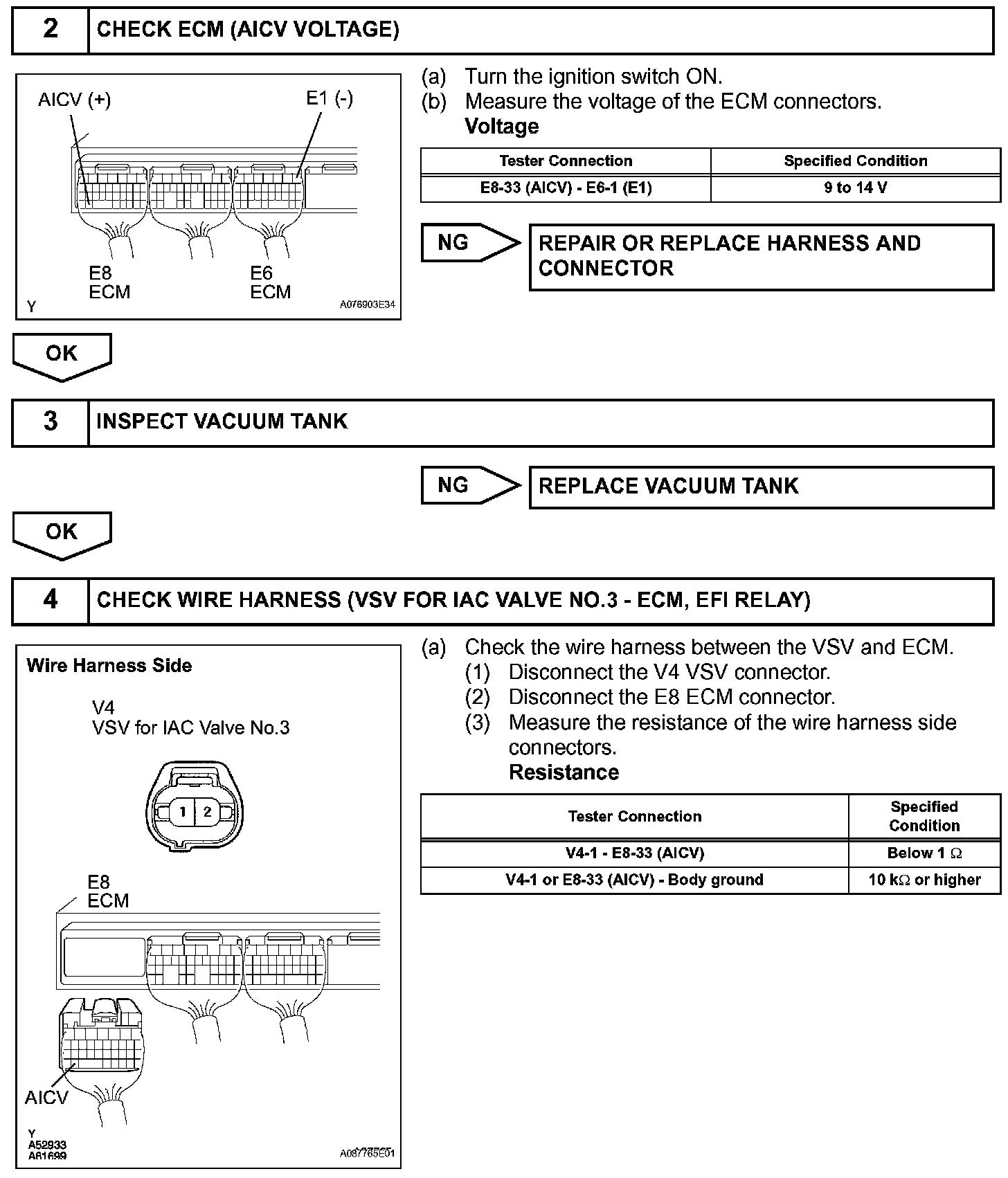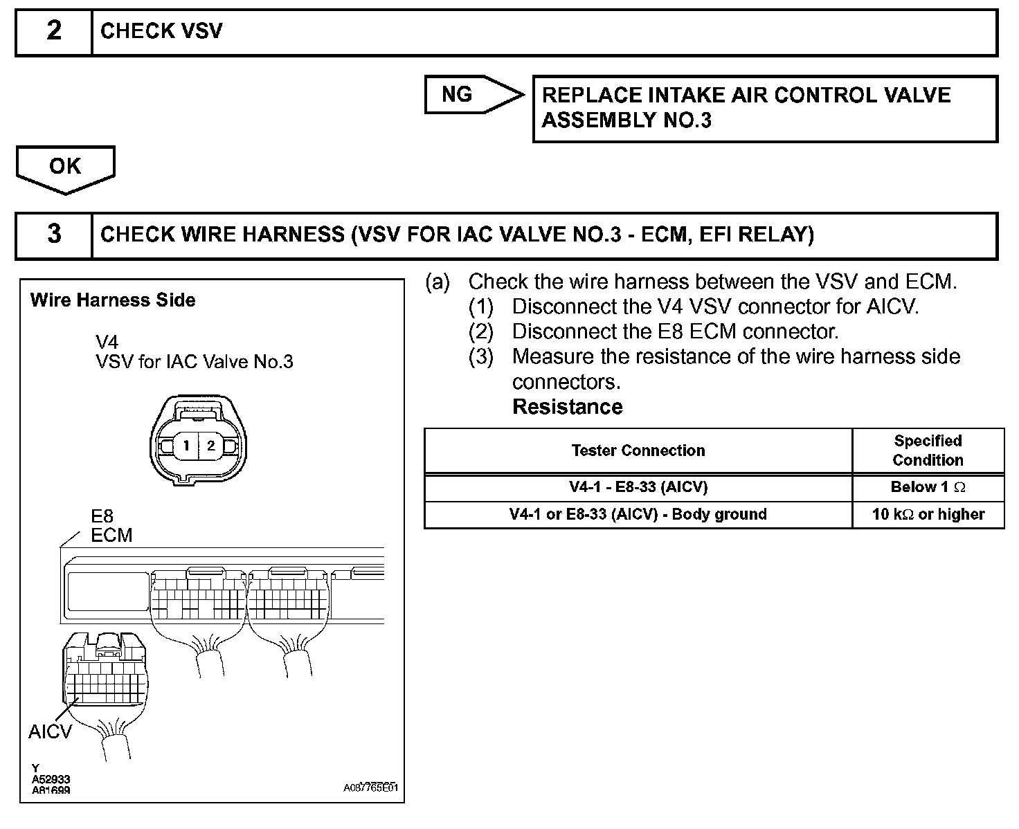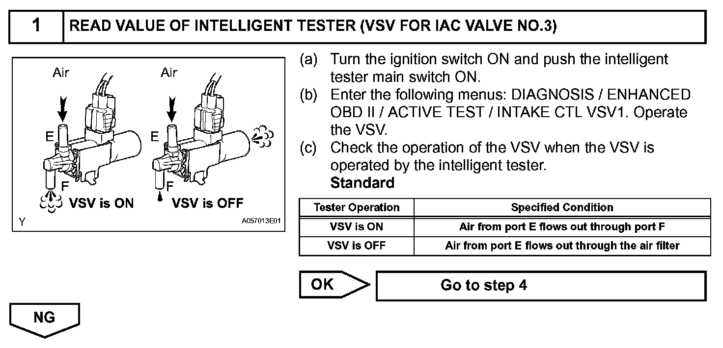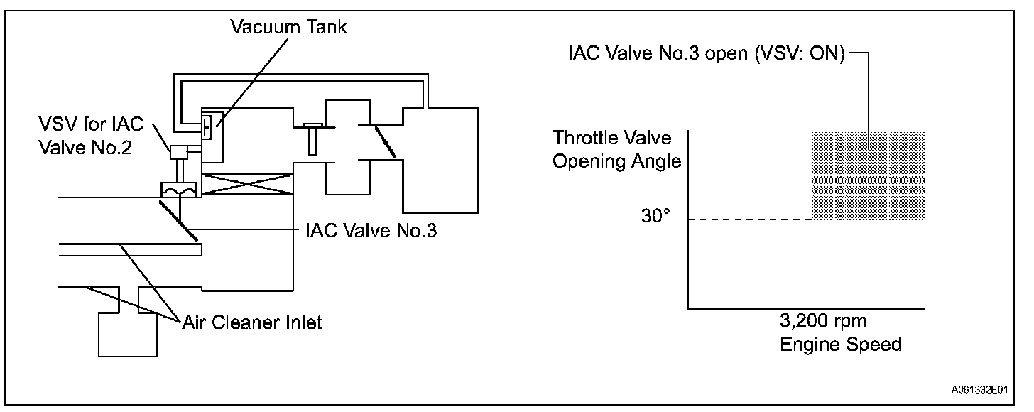 When the engine is operating at low to mid speeds, this system operates the IAC valve to close one of the air cleaner inlets. When the engine speed is more than 3,200 rpm and the opening angle of the throttle valve is more than 30 degrees , the ECM activates the VSV and opens the IAC valve No. 3.