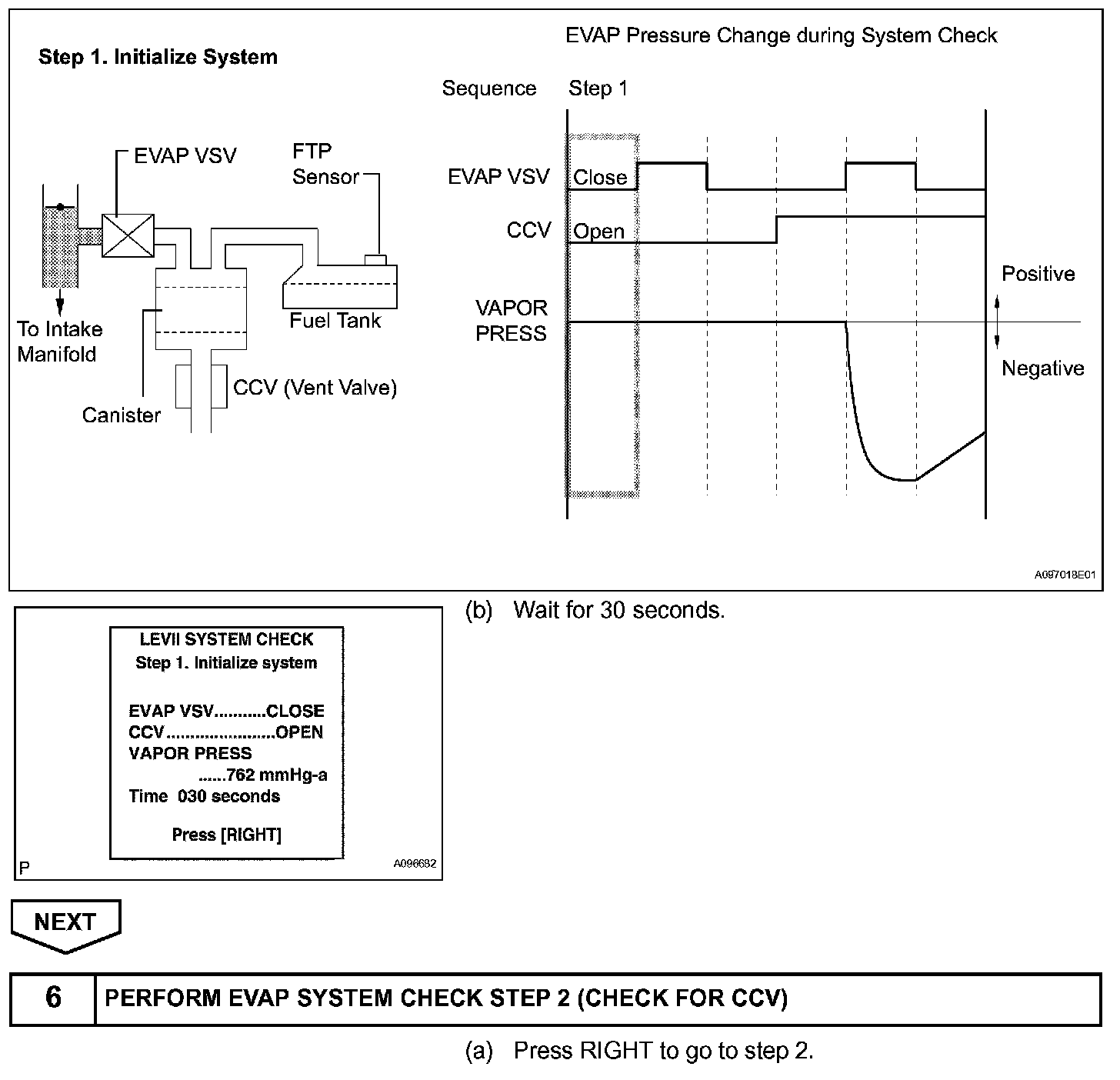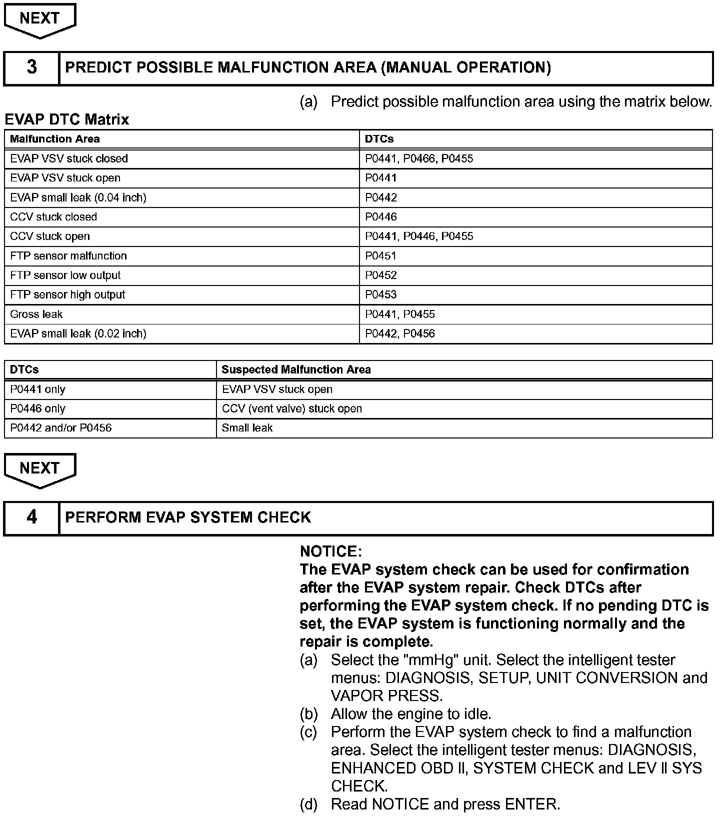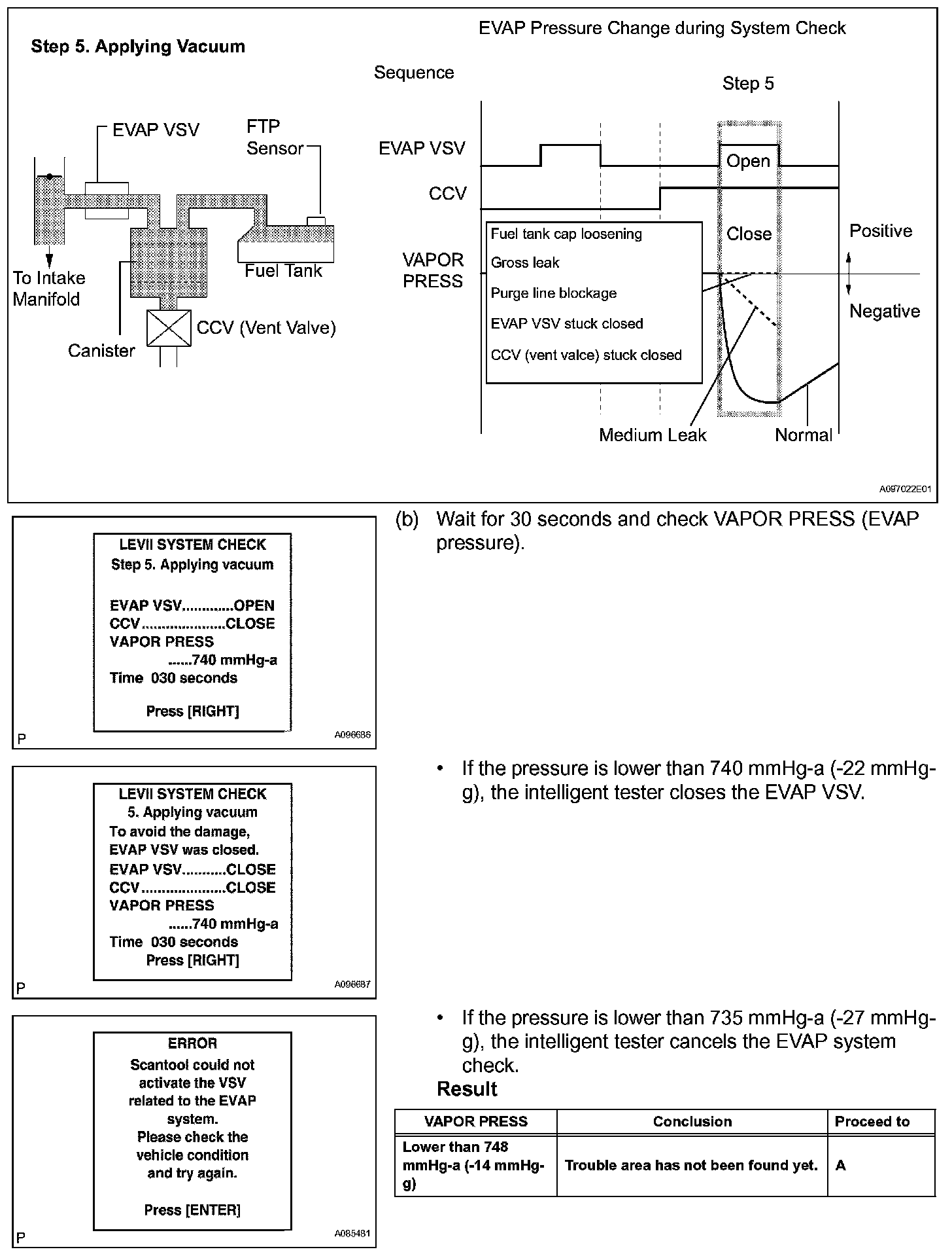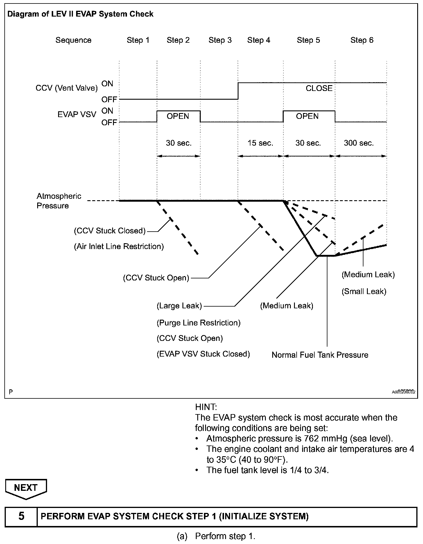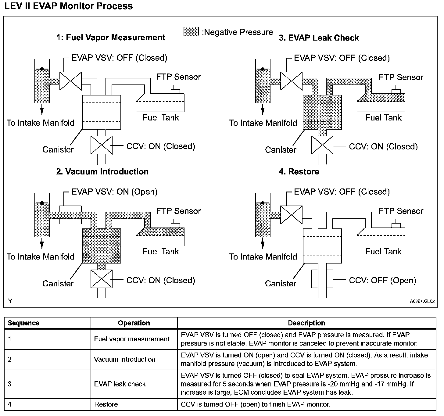 The EVAP monitor's purpose is to check for EVAP leaks and EVAP VSV and CCV malfunctions. The monitor performs the check by first introducing the intake manifold's negative pressure (vacuum) to the EVAP system. Then, the monitor records change in the EVAP system's pressure levels. The monitor runs when the following conditions are met: