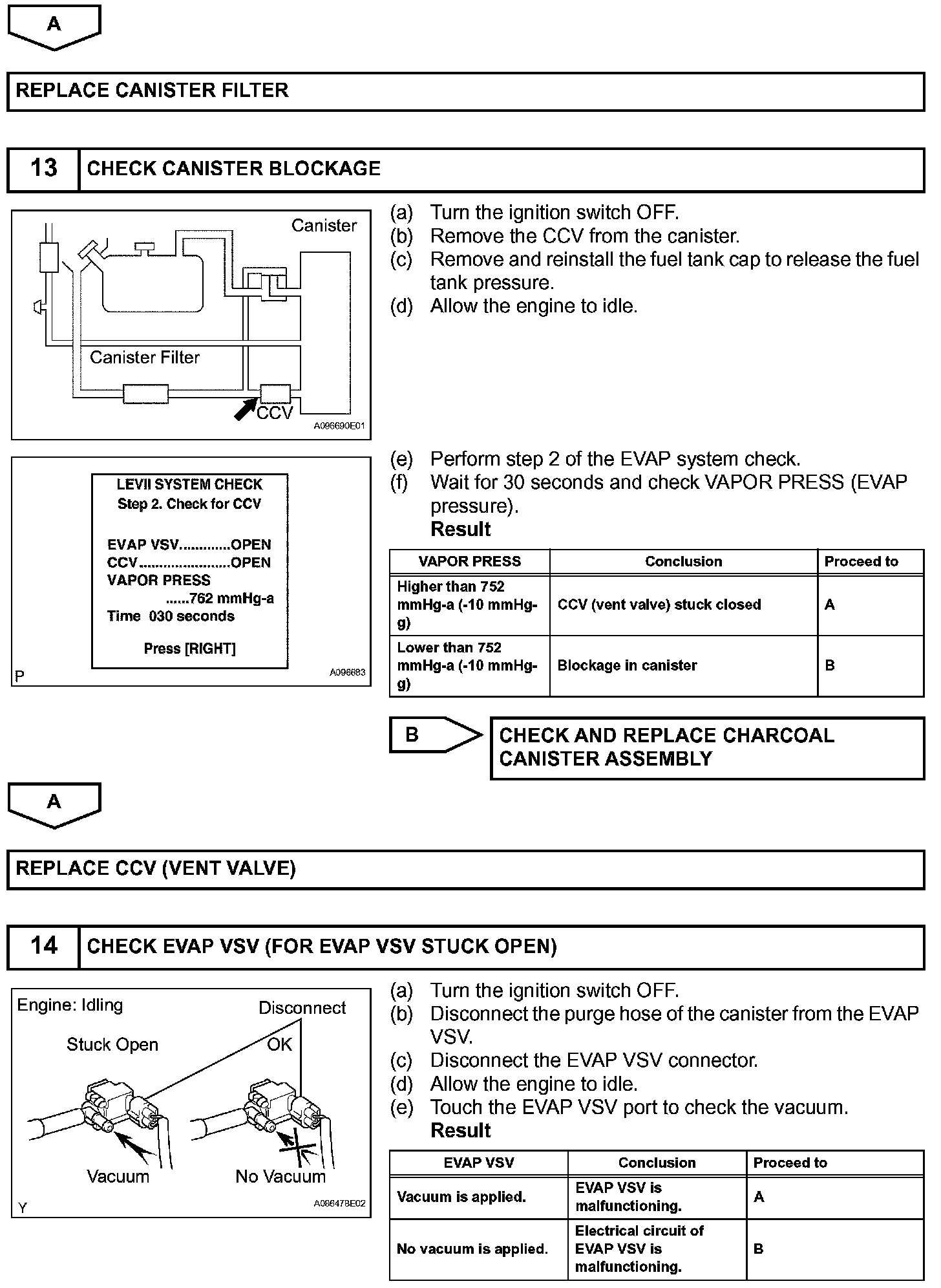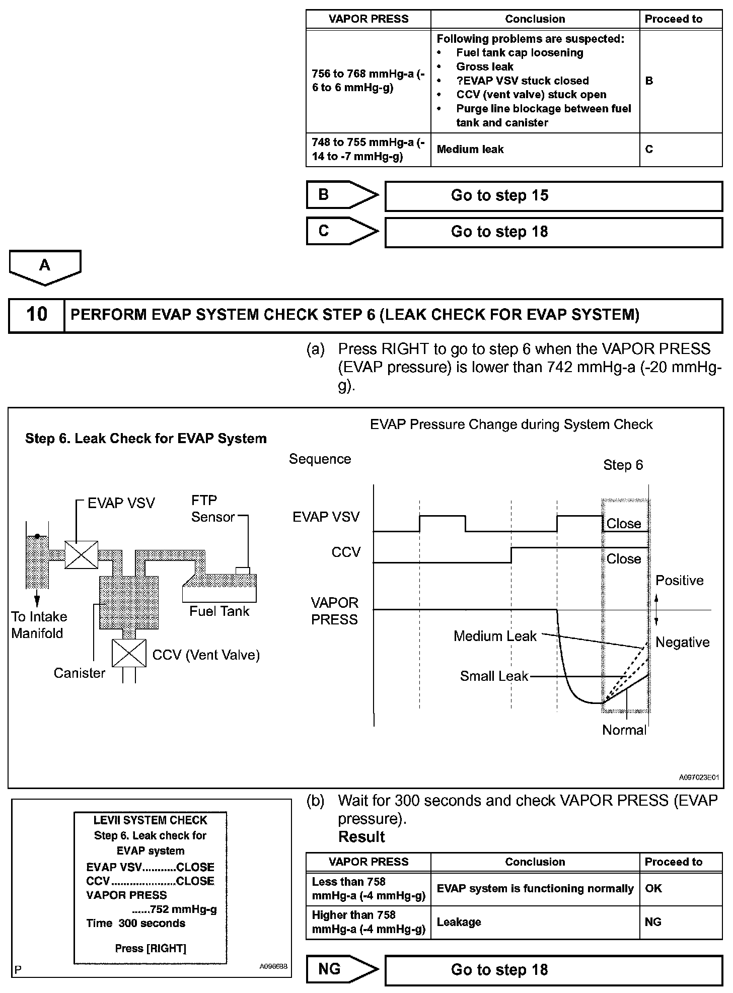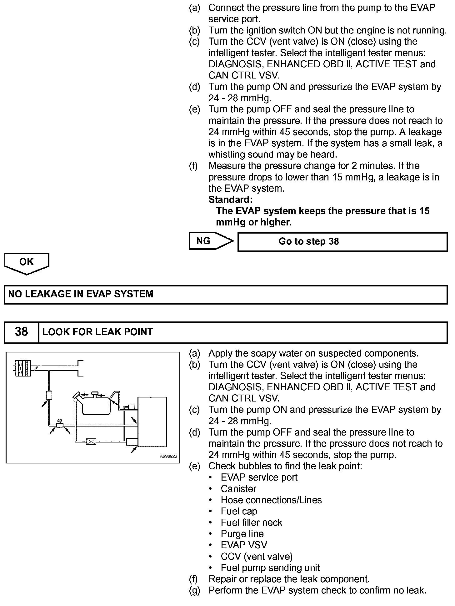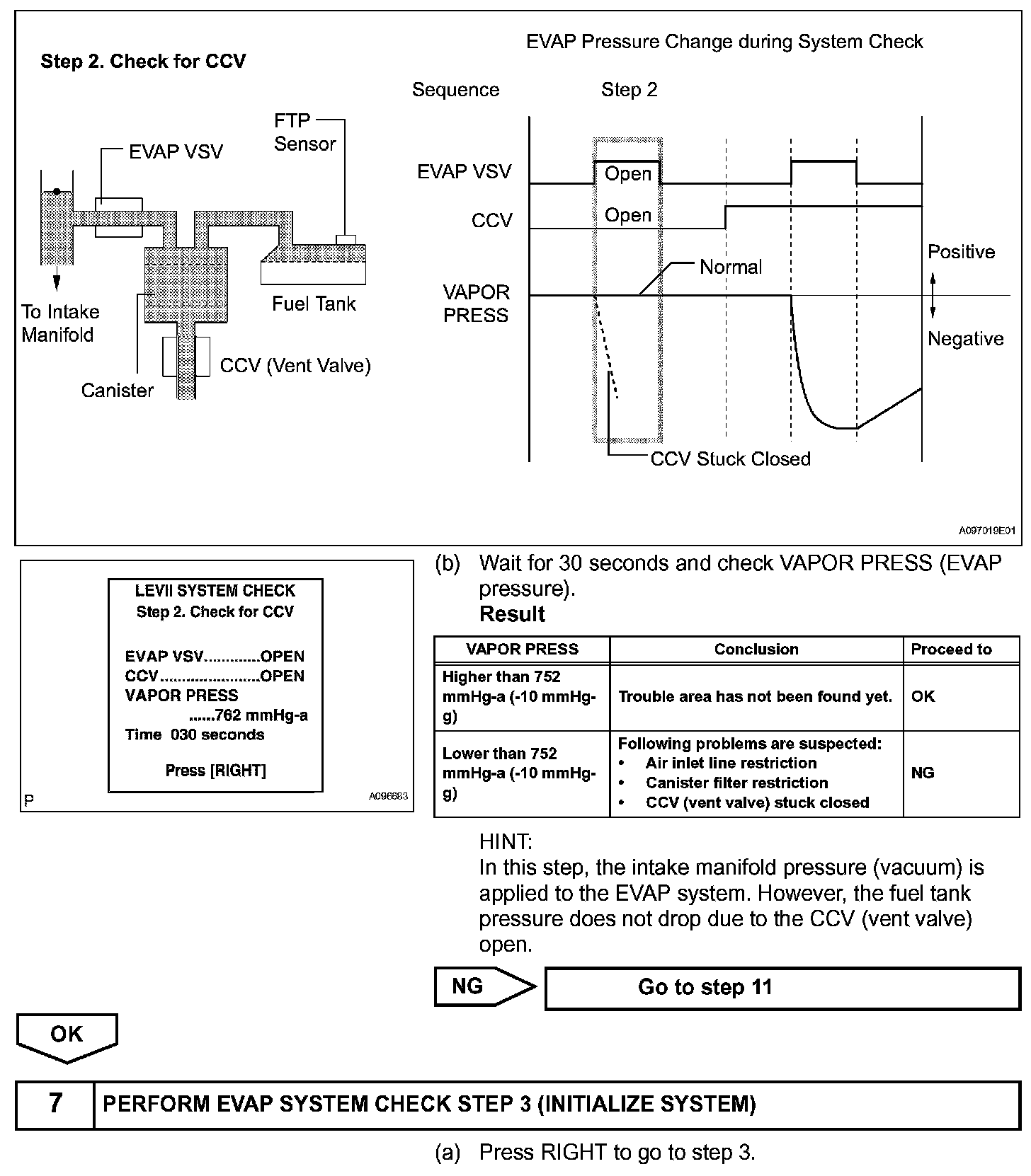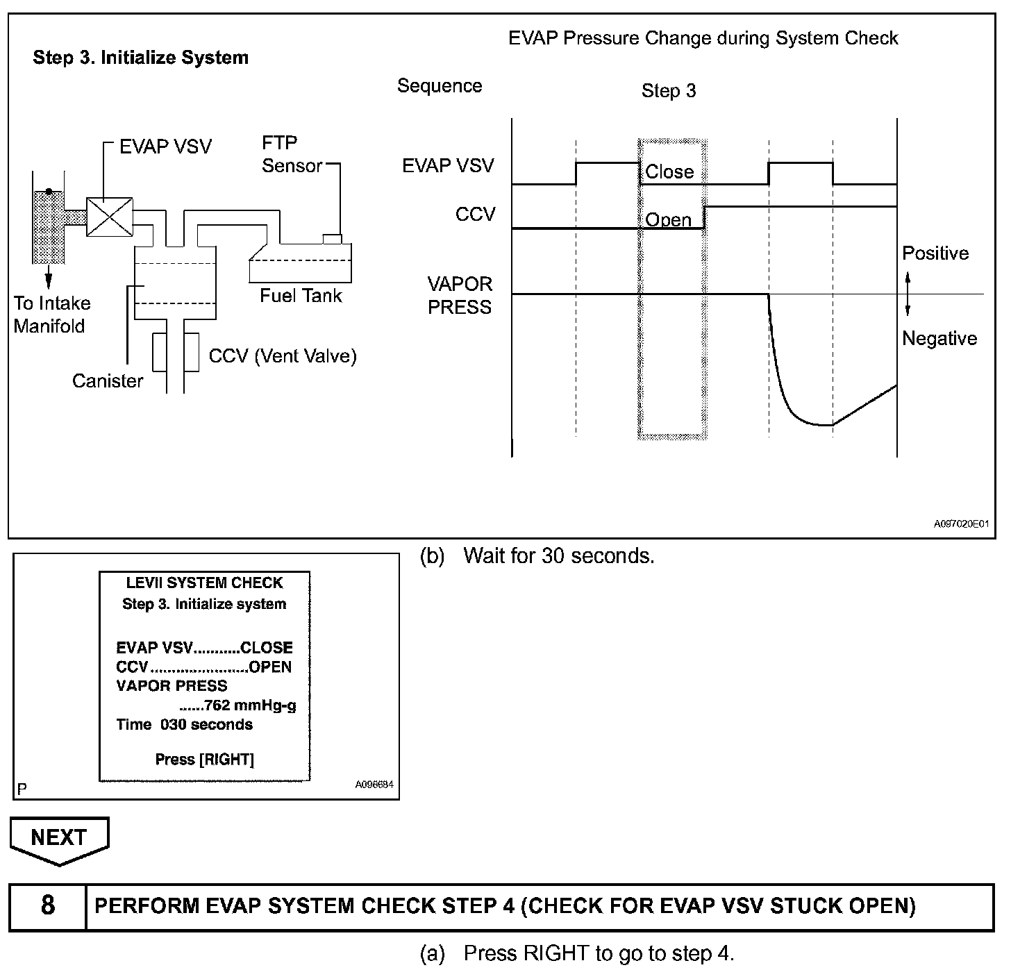 The EVAP monitor's purpose is to check for EVAP leaks and EVAP VSV and CCV malfunctions. The monitor performs the check by first introducing the intake manifold's negative pressure (vacuum) to the EVAP system. Then, the monitor records change in the EVAP system's pressure levels. The monitor runs when the following conditions are met: