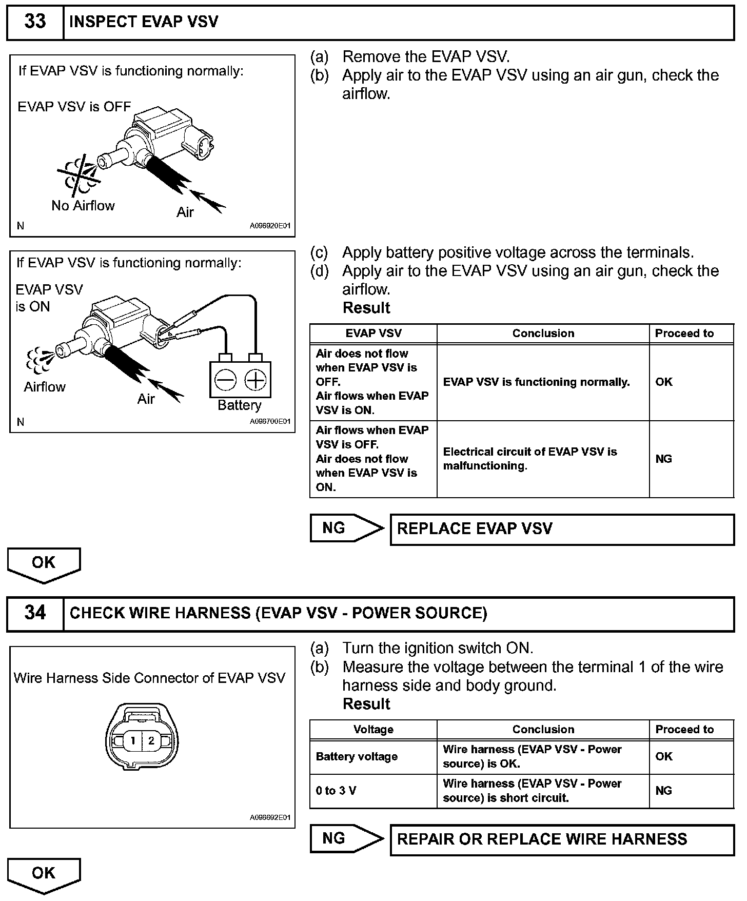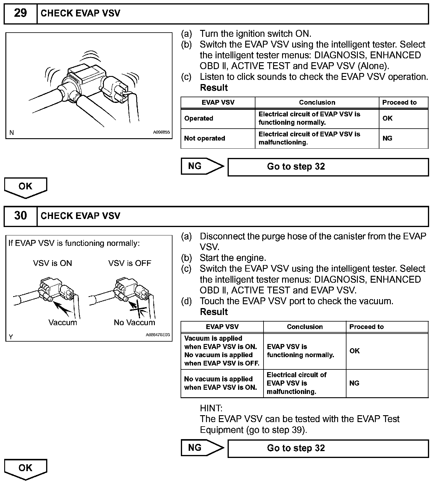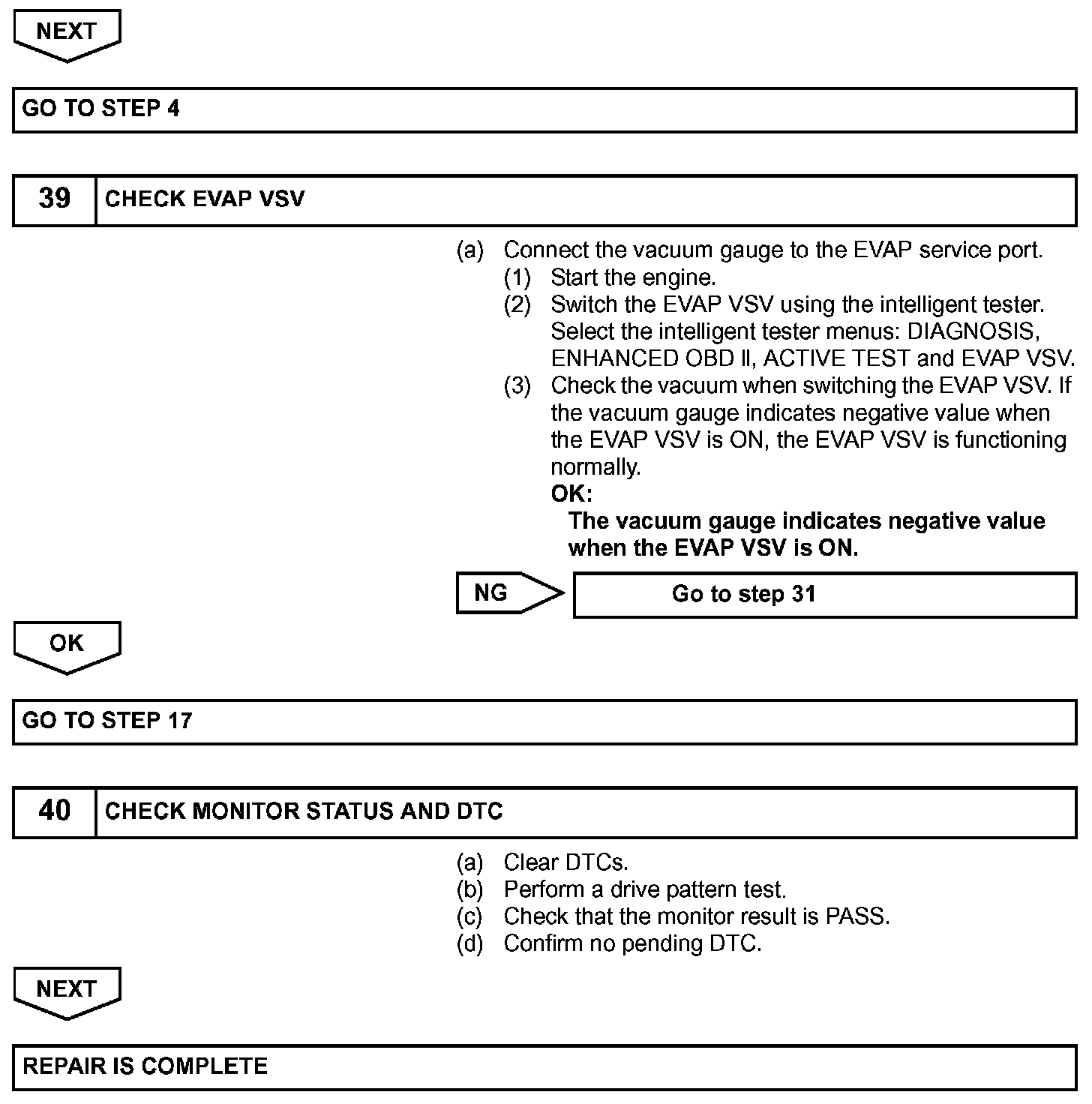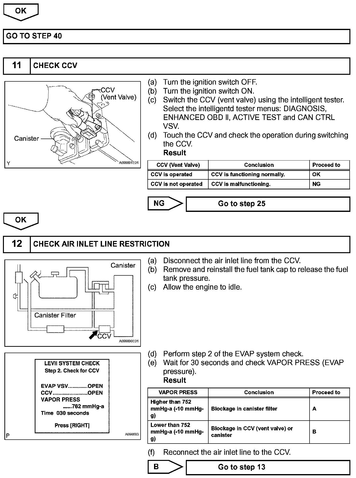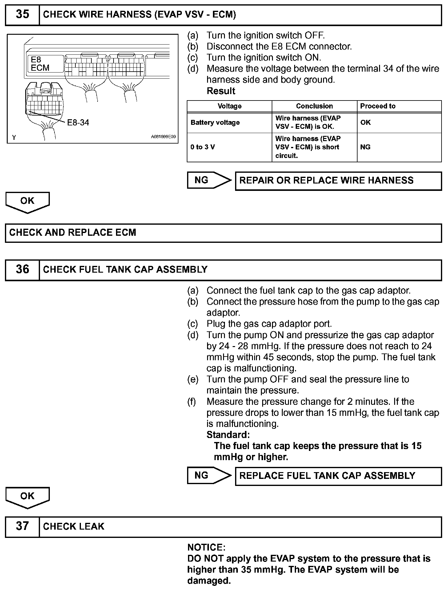 The EVAP monitor's purpose is to check for EVAP leaks and EVAP VSV and CCV malfunctions. The monitor performs the check by first introducing the intake manifold's negative pressure (vacuum) to the EVAP system. Then, the monitor records change in the EVAP system's pressure levels. The monitor runs when the following conditions are met: