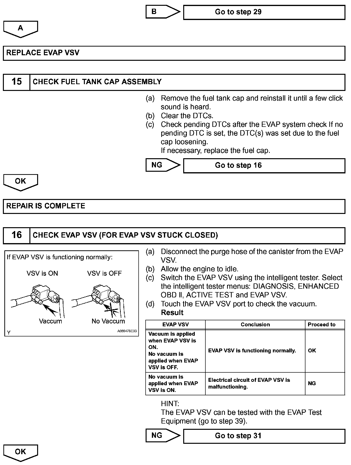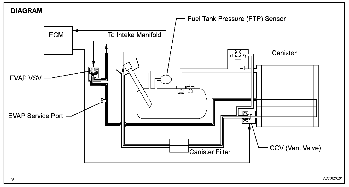When predetermined conditions (closed loop, etc.) are met, the EVAP VSV is opened and stored fuel vapor in the canister is purged to the intake manifold. The ECM changes duty-cycle to the EVAP VSV to control purge flow volume. Purge flow volume is determined by the intake manifold pressure. Atmospheric pressure is allowed into the canister through the vent valve (CCV) to ensure that purge flow is maintained when negative pressure (vacuum) is applied to the canister. This EVAP system contains given components: