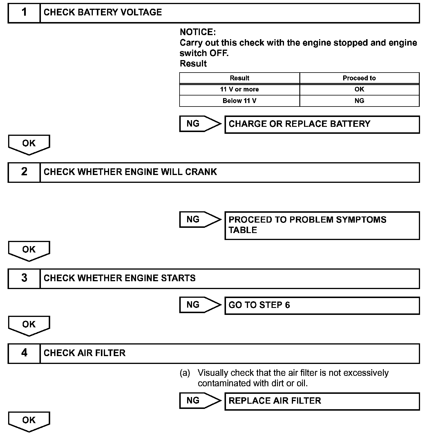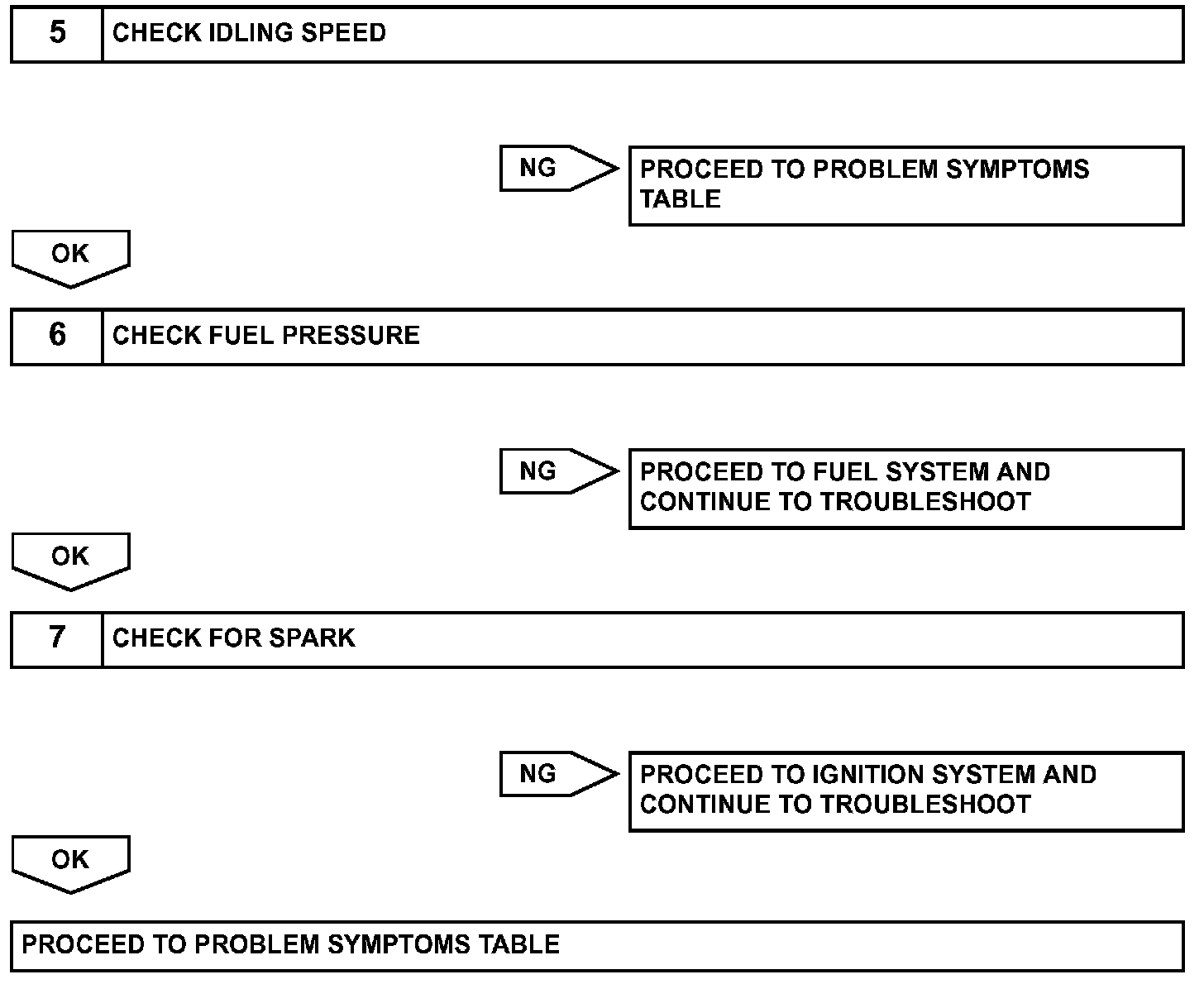 When the malfunction is not confirmed by the DTC check, troubleshooting should be carried out in all circuits considered to be possible causes of the problem. In many cases, by carrying out the basic engine check shown in the flowchart, the location of the problem can be found quickly and efficiently. Therefore, using this check is essential when engine troubleshooting.