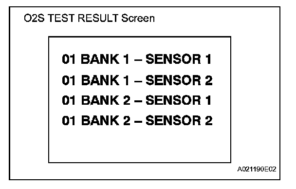 b. On the tester screen, select the following menus: DIAGNOSIS / CARB OBD II / O2S TEST RESULT. A list of the O2S equipped on the vehicle will be displayed.