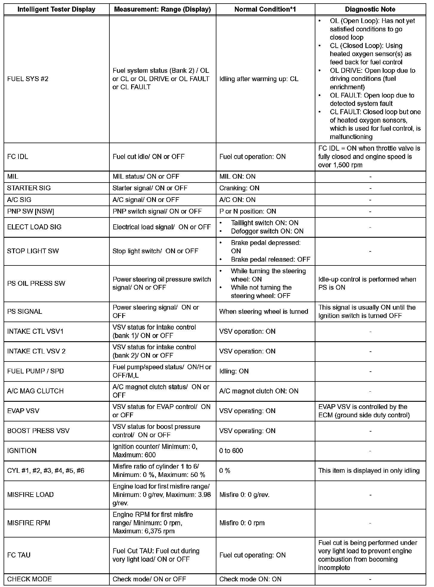 DATA LISTHINT: Using the intelligent tester's DATA LIST allows switch, sensor, actuator and other item values to be read without removing any parts. Reading the DATA LIST early in troubleshooting is one way to save time.