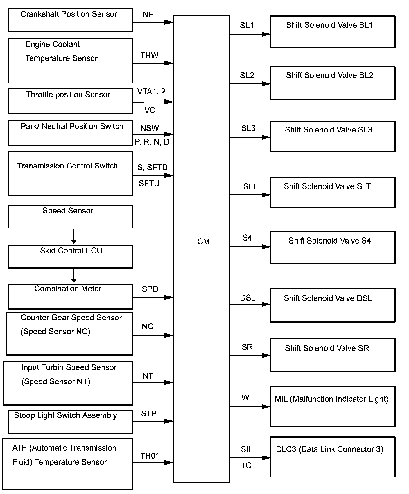 The configuration of the electronic control system in the U151E automatic transaxles is as shown in the chart.