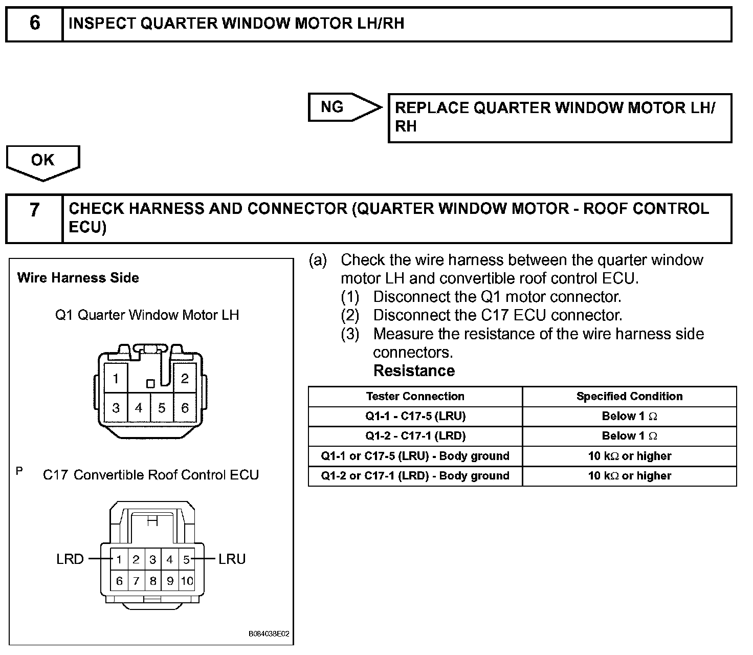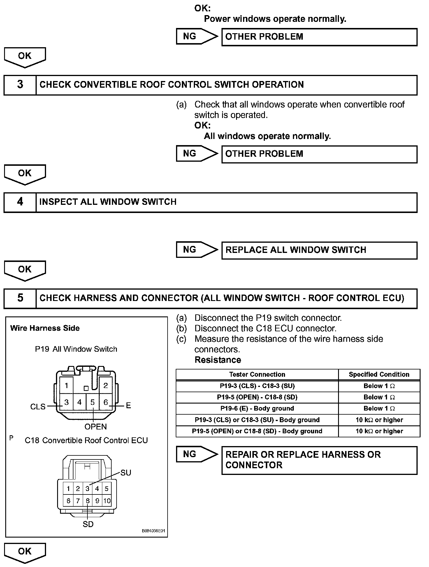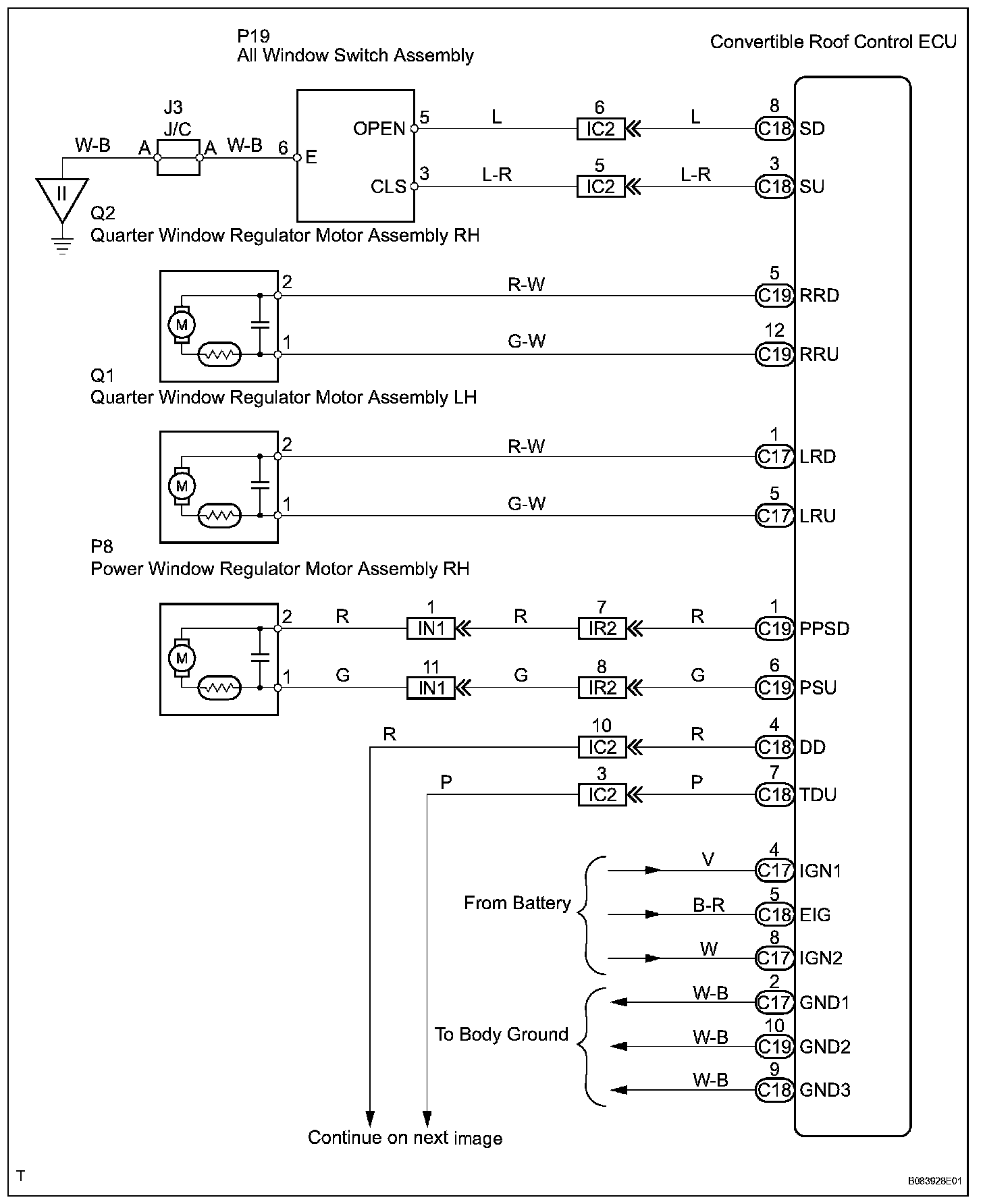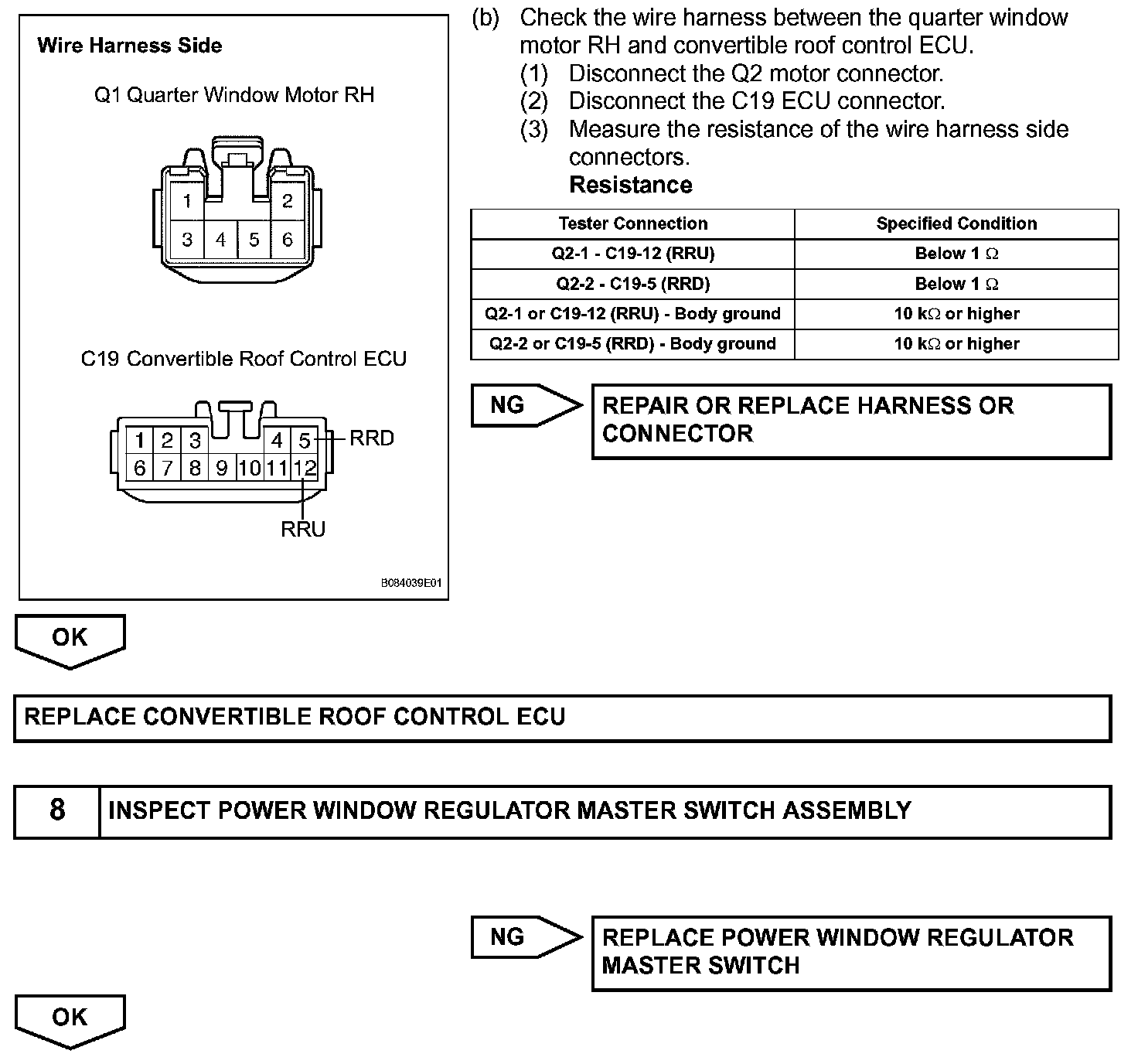 The all window switch can operate all the power windows. The all window switch outputs signals to the convertible roof control ECU which activates the passenger, quarter LH/RH window regulator motors directly. For the driver window regulator motor, the convertible control ECU outputs signals to the master switch, and the master switch activates the driver window regulator motor.