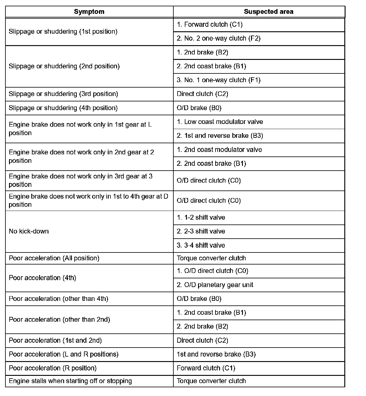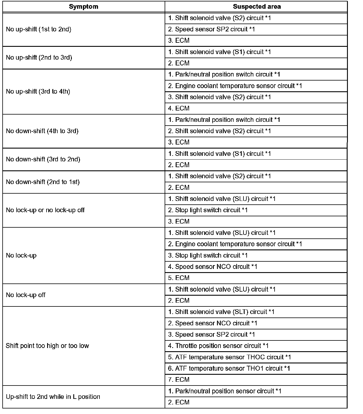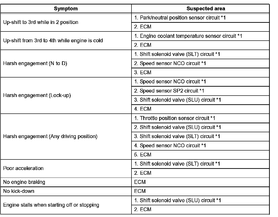 Refer to the table when the trouble cause is considered to be electrical. The instruction "Proceed to next circuit inspection shown on matrix chart" is given in the flow chart for each circuit, proceed to the circuit with the next highest number in the table to continue the check. If the trouble still occurs even though there are no abnormalities in any of the other circuits, then check and replace the ECM.