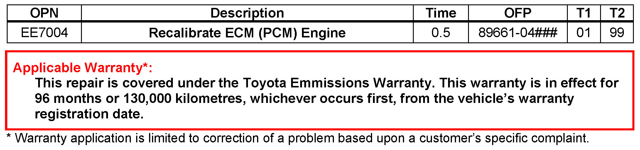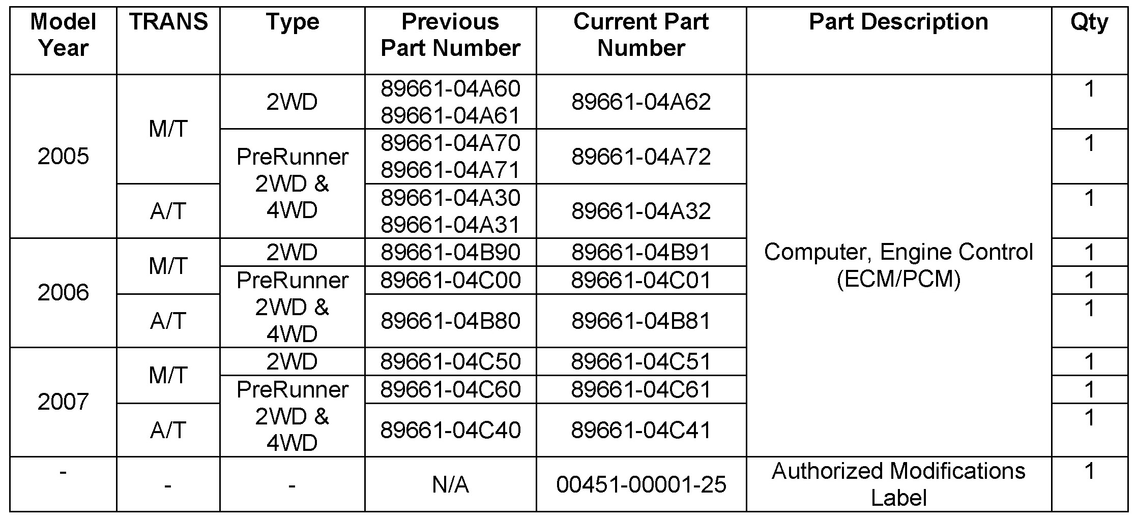 - May 7, 2007: 2007 model year has been added to Applicable Vehicles. Part numbers and calibration data for 2007 model year have been added to the Parts Information table and the Calibration Identification Chart.