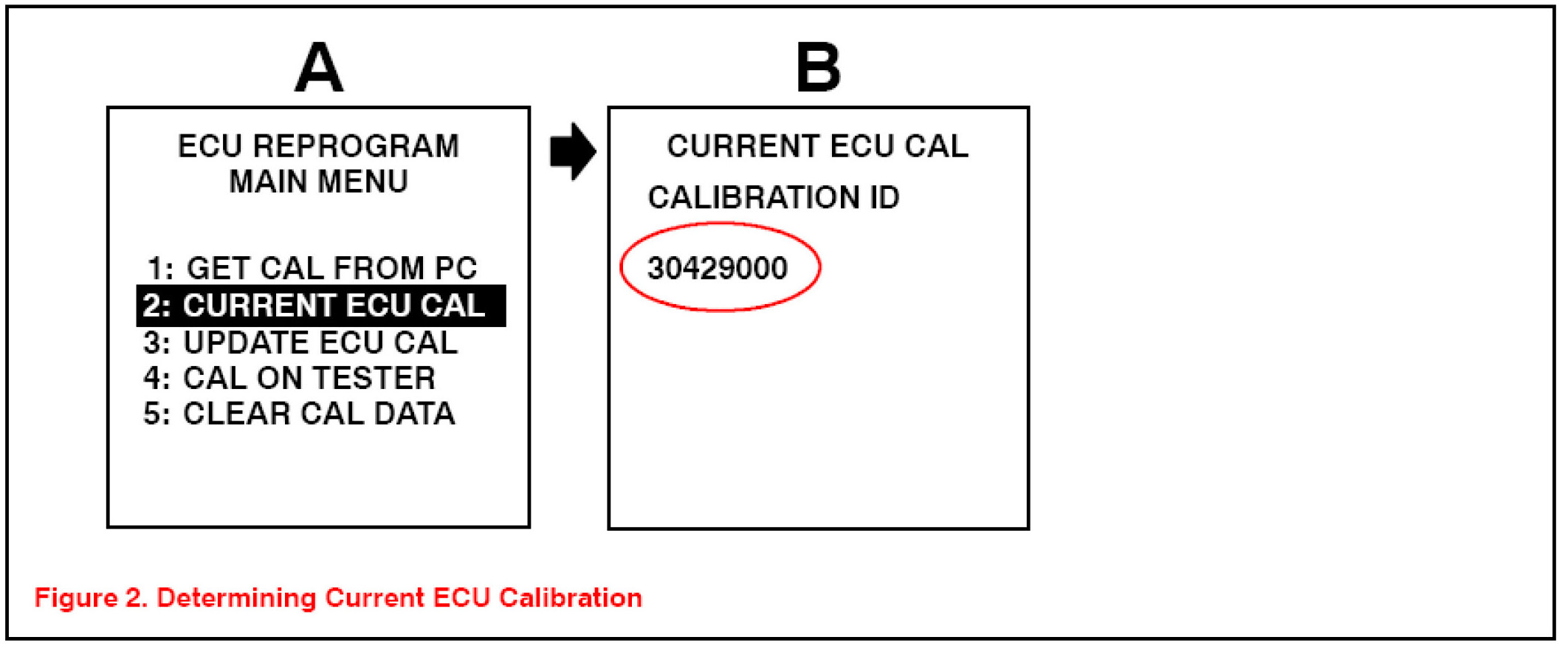 2. Connect the Diagnostic Tester to the vehicle and select CURRENT ECU CAL from the ECU REPROGRAM MAIN MENU. Determine the vehicle's current ECU calibrations (see Figure 2).