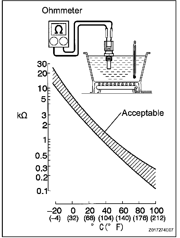 NOTE: If checking the engine coolant temperature sensor in water, be careful not to allow water to enter the terminals. After checking, wipe the water off the engine coolant temperature sensor.