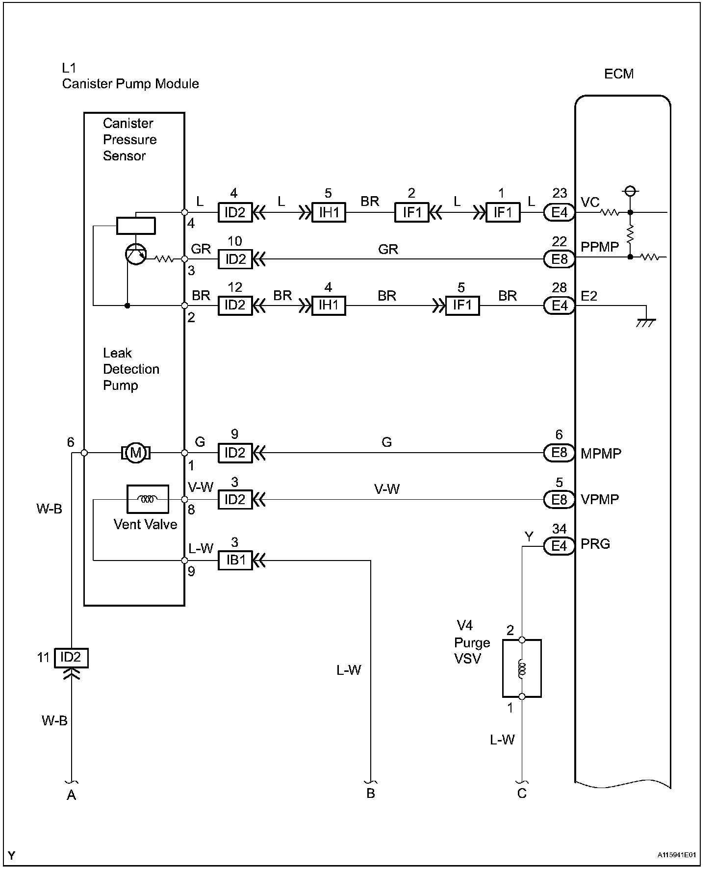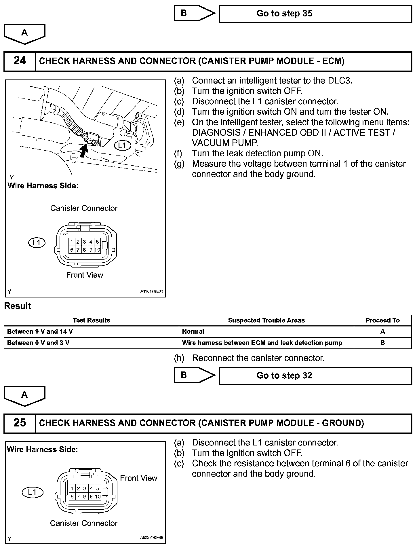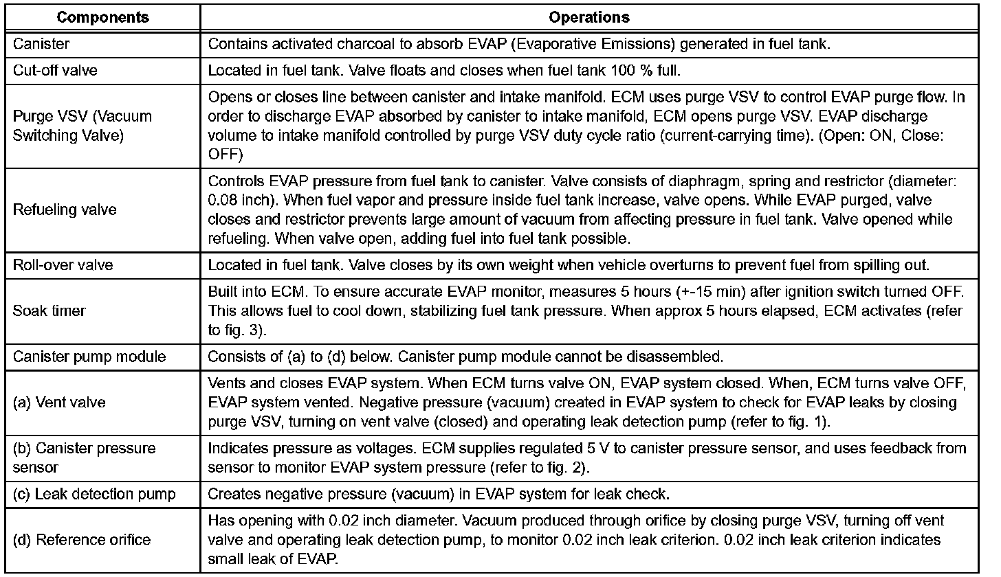 The electric leak detection pump creates negative pressure (vacuum) in the EVAP system and the pressure is measured. Finally, the ECM monitors for leaks from the EVAP system, and malfunctions in both the canister pump module and purge VSV, based on the EVAP pressure.