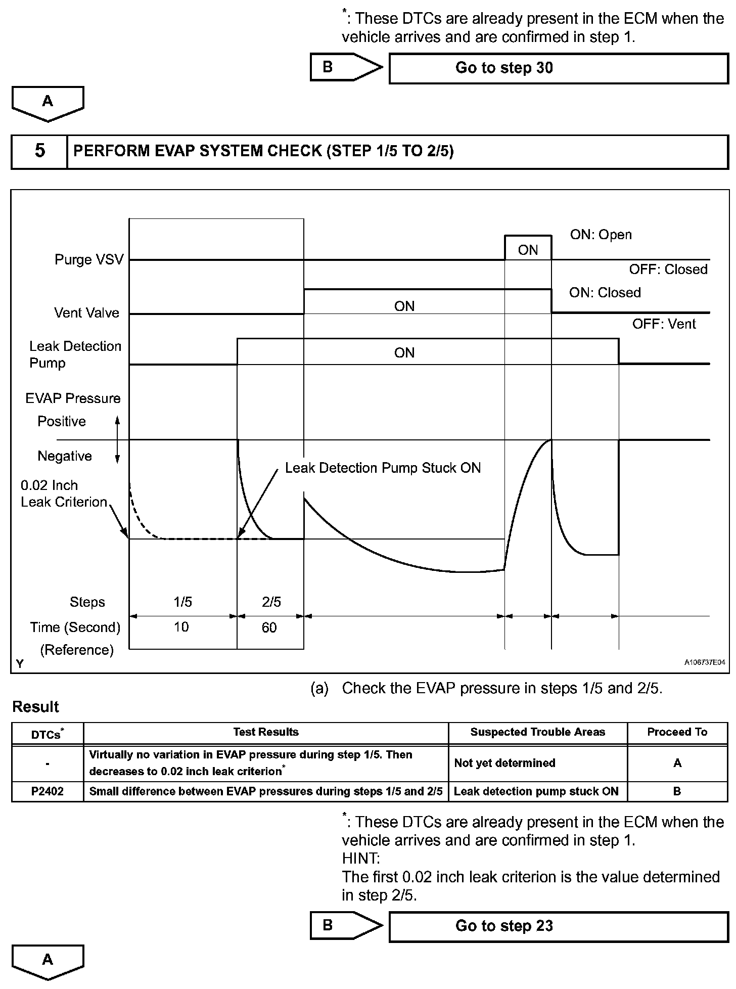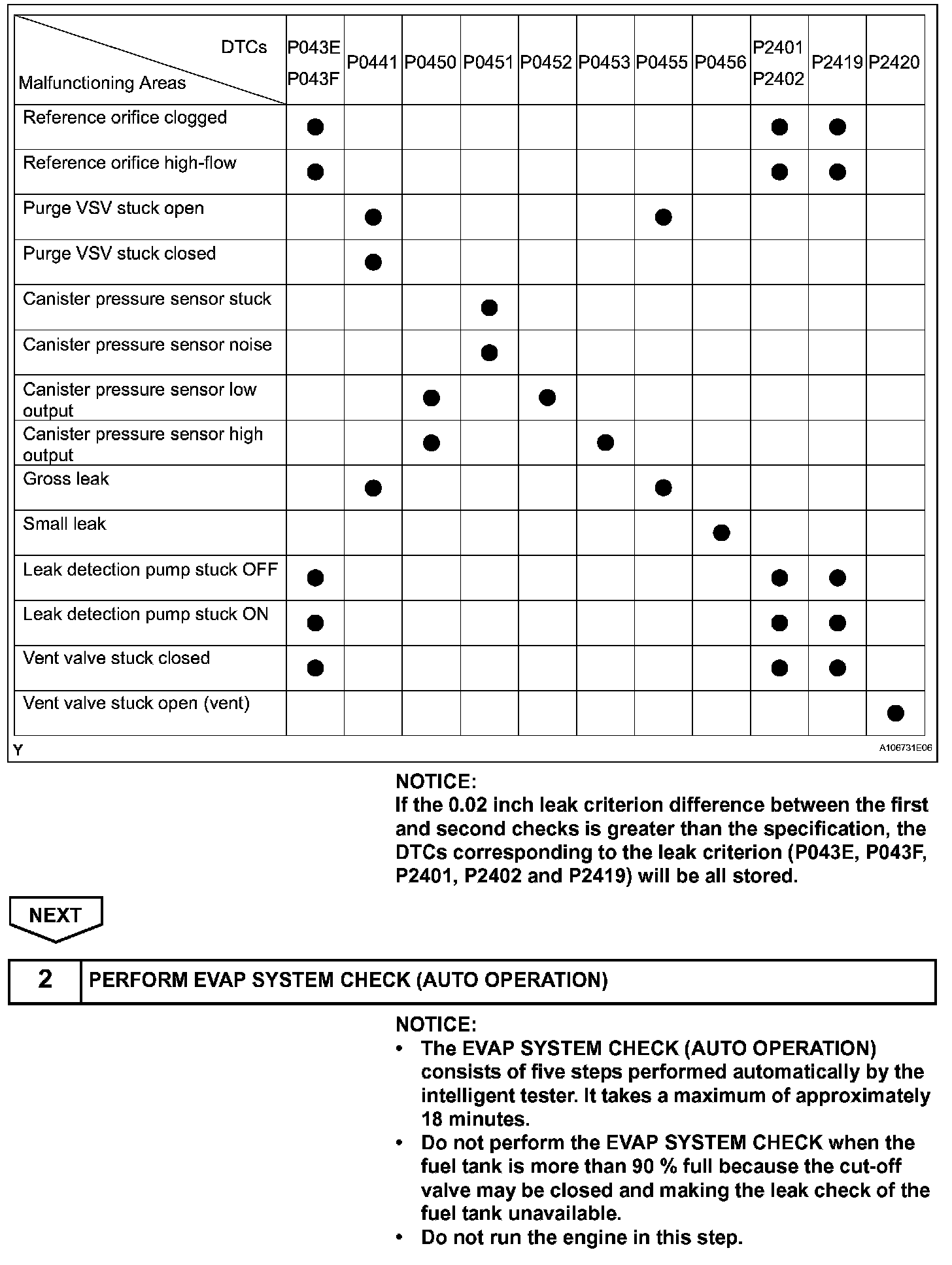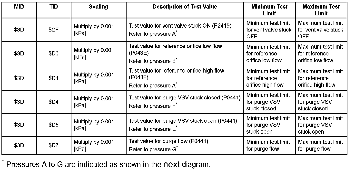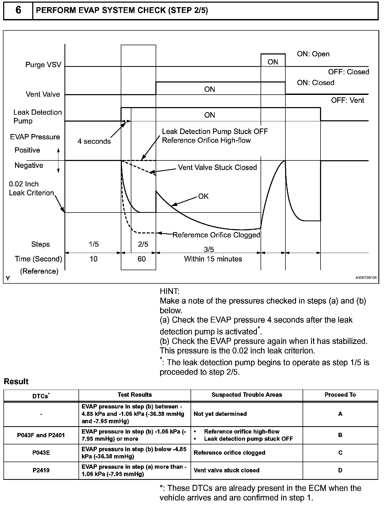 NOTE: If the 0.02 inch leak criterion difference between the first and second checks is greater than the specification, the DTCs corresponding to the leak criterion (P043E, P043F, P2401, P2402 and P2419) will be all stored.