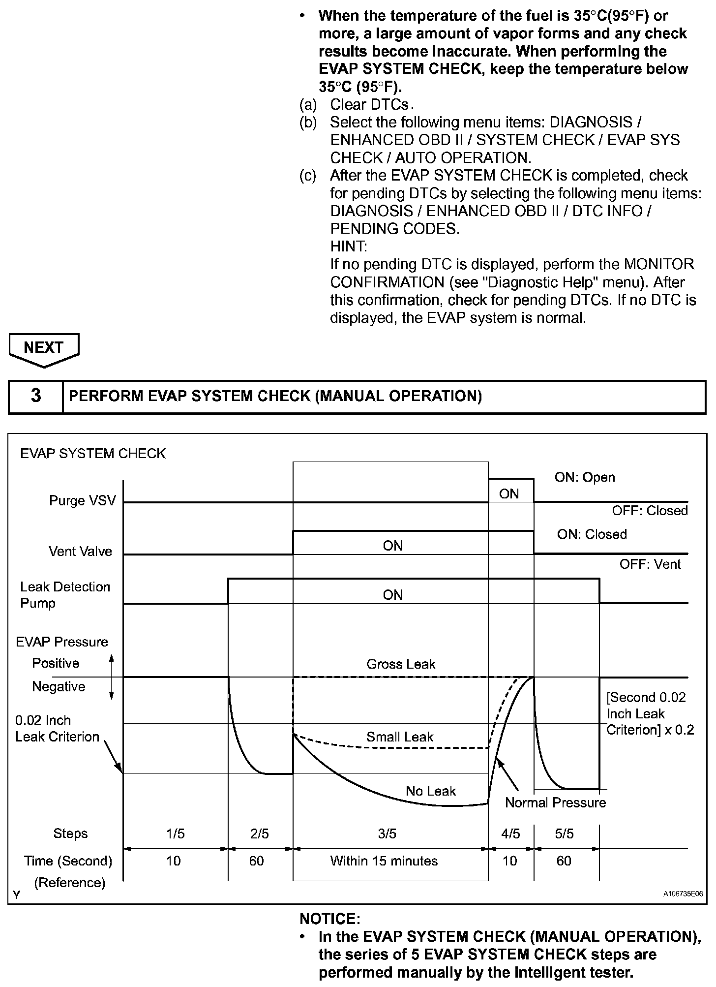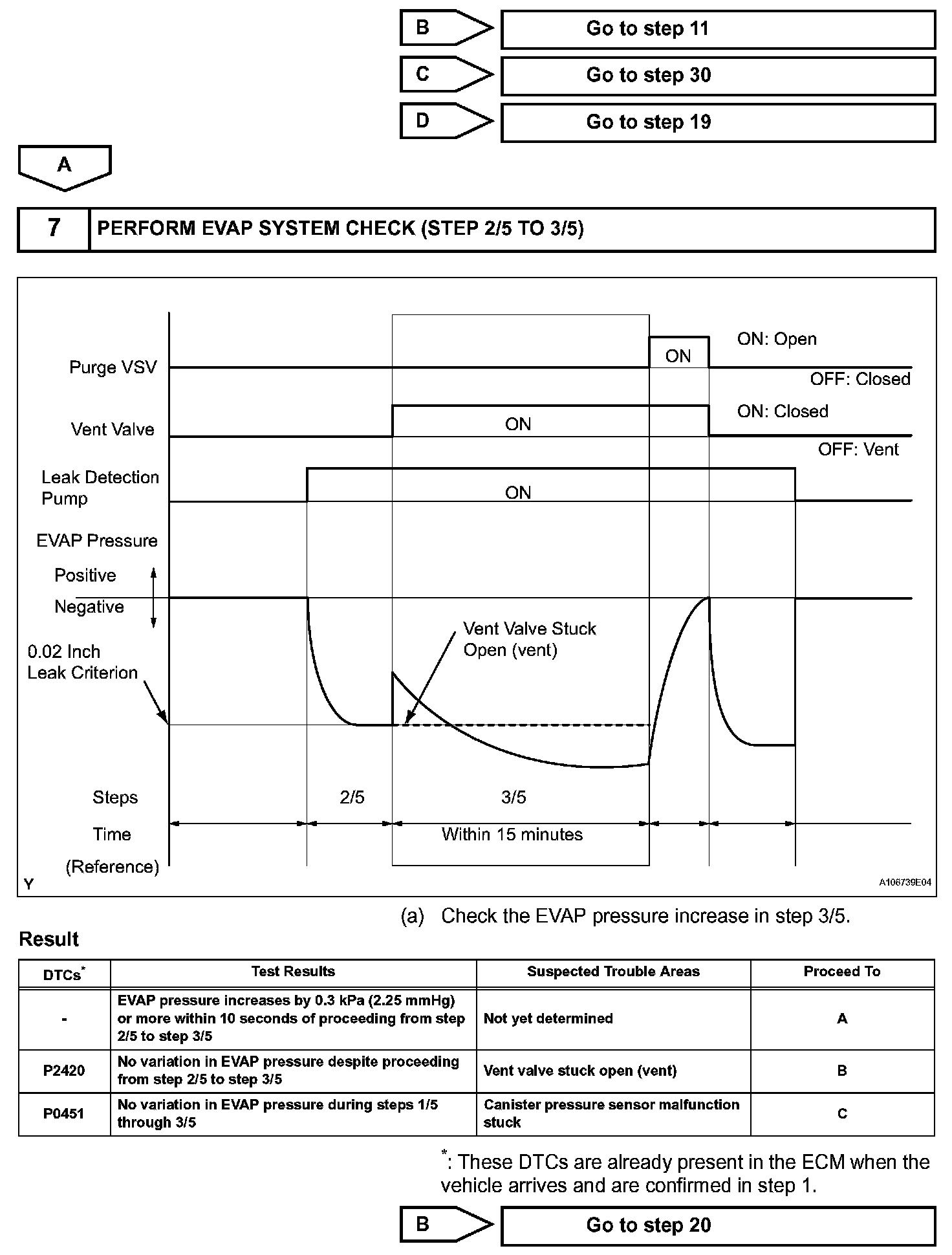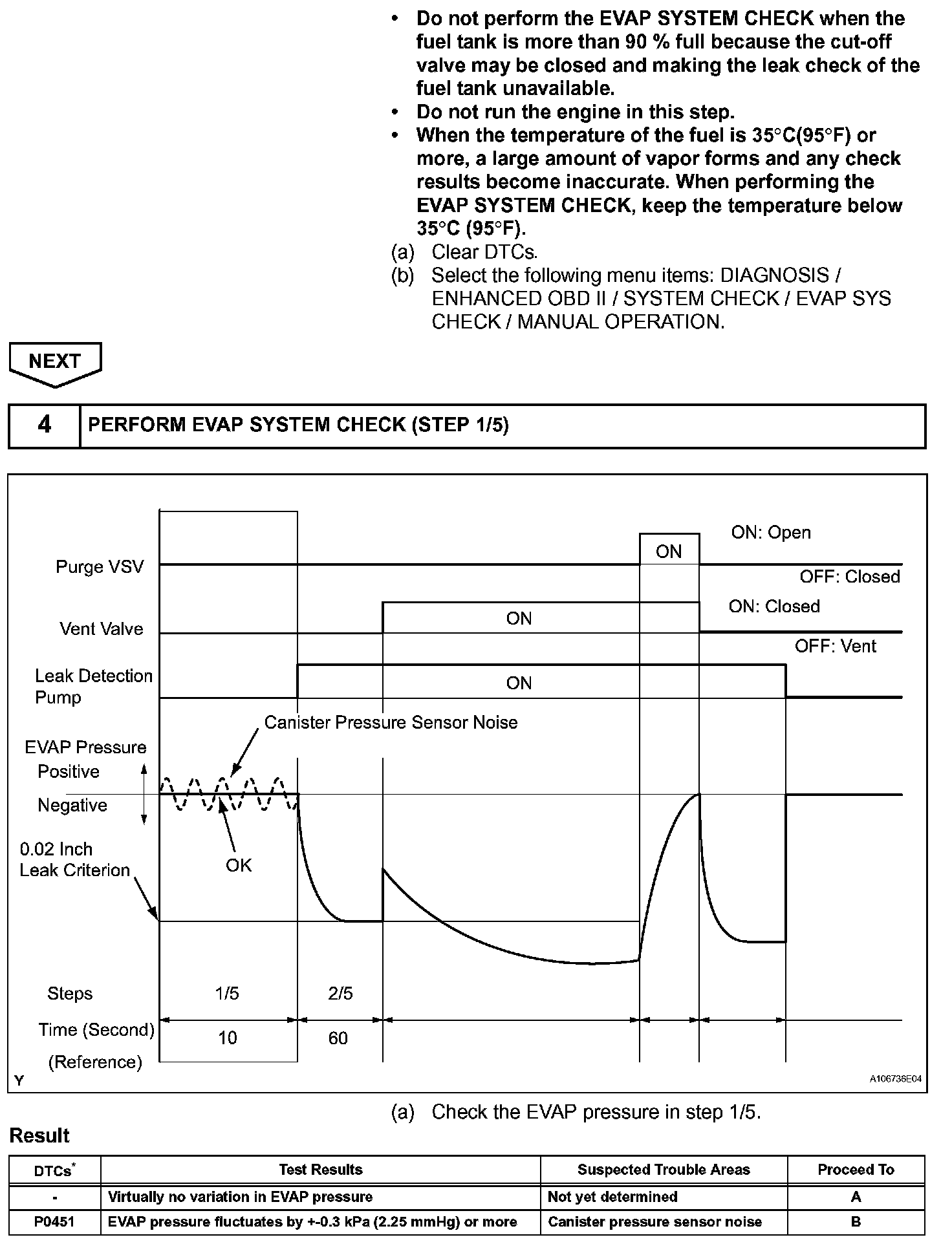 NOTE: If the 0.02 inch leak criterion difference between the first and second checks is greater than the specification, the DTCs corresponding to the leak criterion (P043E, P043F, P2401, P2402 and P2419) will be all stored.