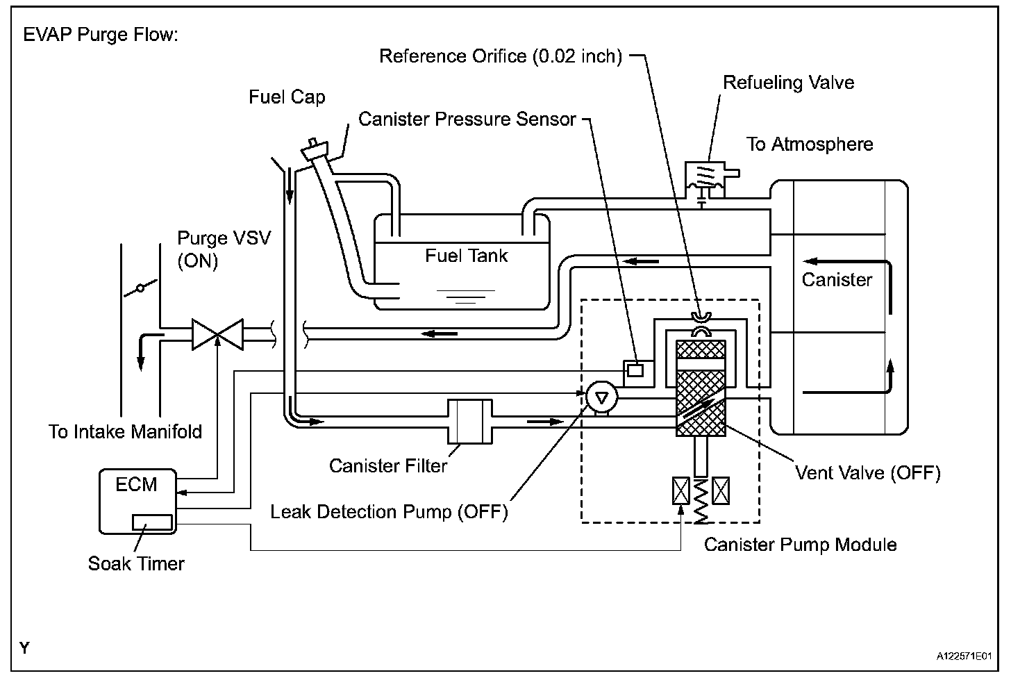 The purge flow volume is also determined by the intake manifold pressure. Atmospheric pressure is allowed into the canister through the vent valve to ensure that the purge flow is maintained when the negative pressure (vacuum) is applied to the canister.