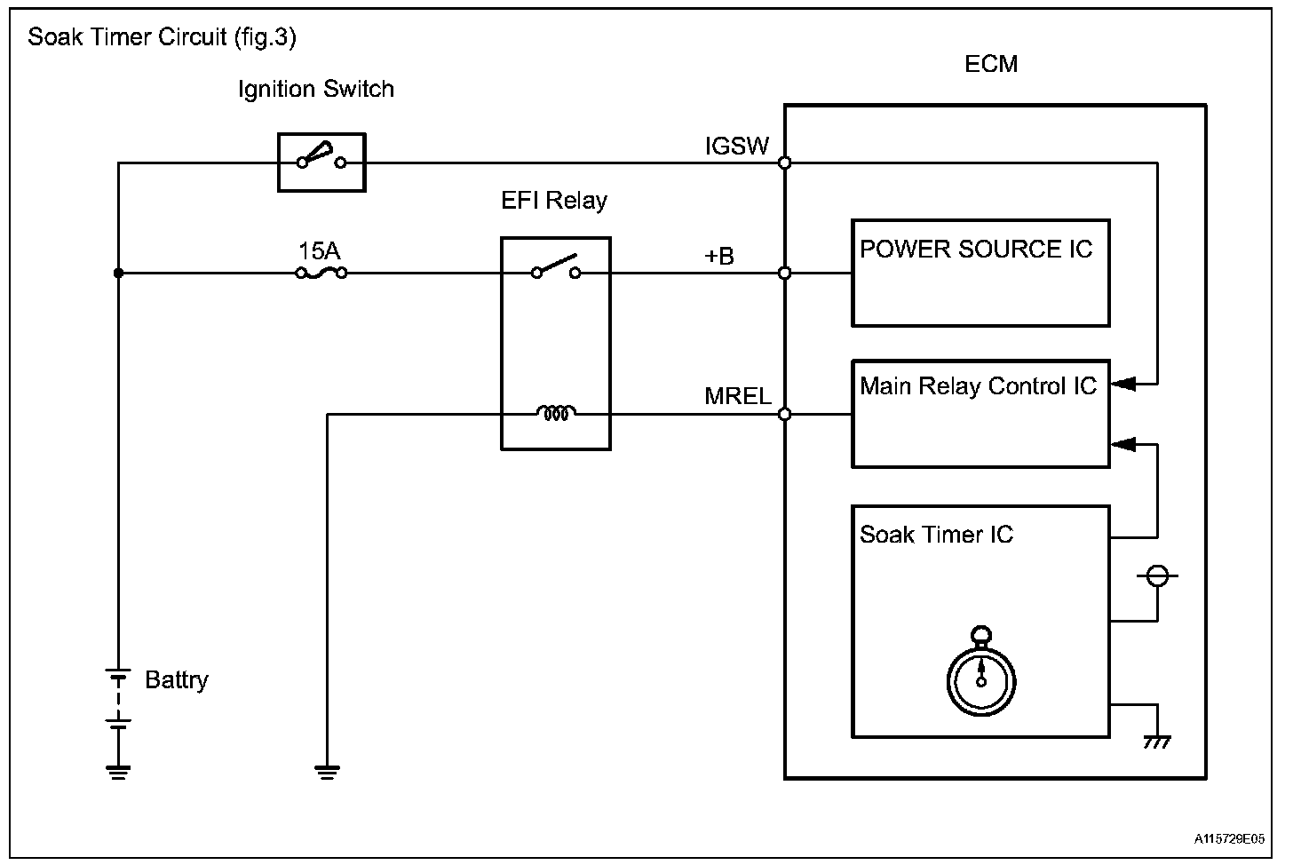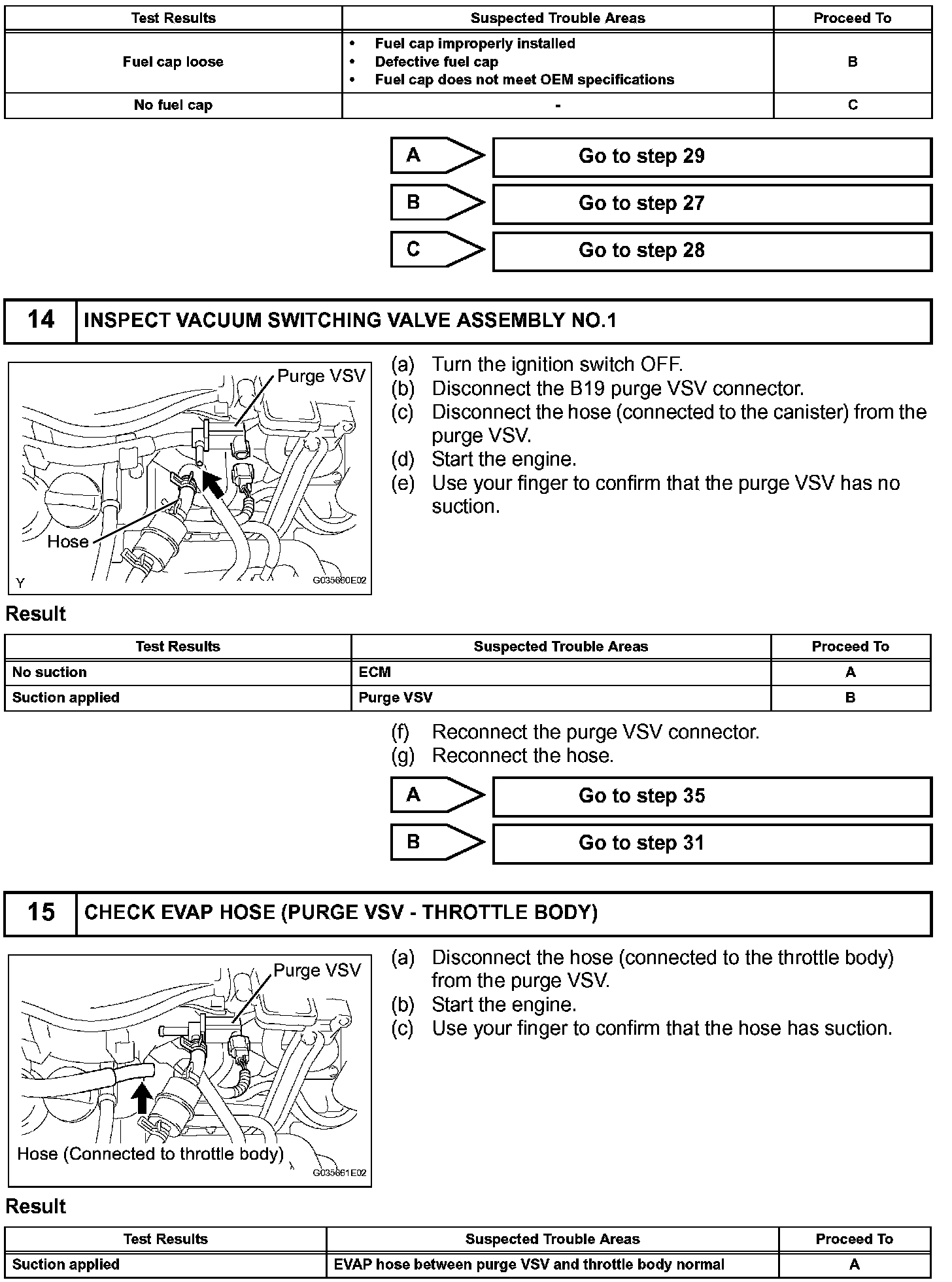 While the engine is running, if a predetermined condition (closed-loop etc.) is met, the purge VSV is opened by the ECM and stored fuel vapors in the canister are purged to the intake manifold. The ECM changes the duty cycle ratio of the purge VSV to control purge flow volume.