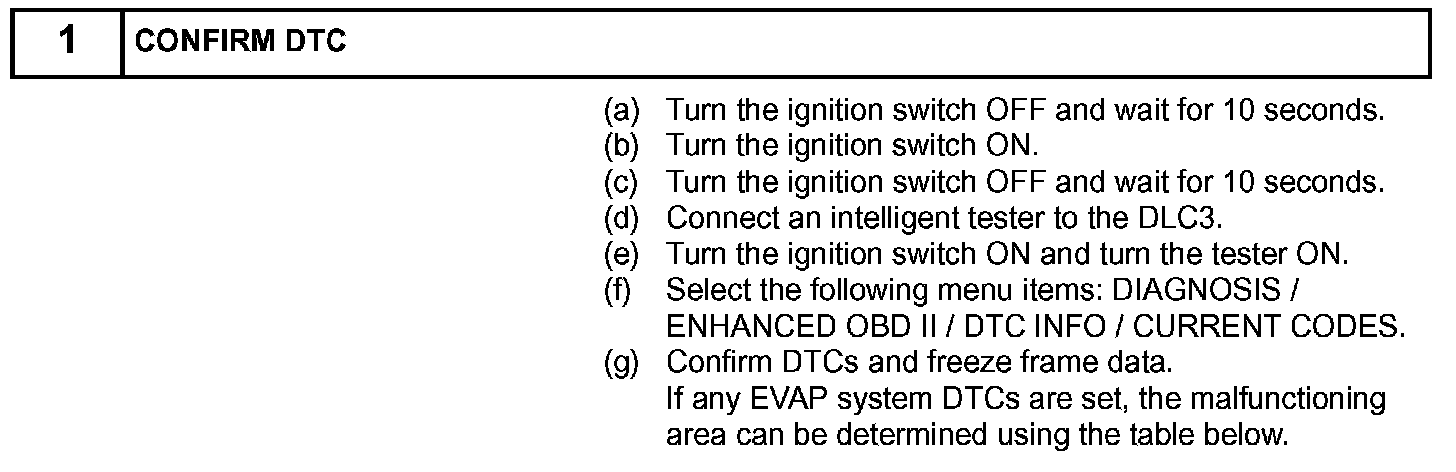 If any EVAP system DTCs are set, the malfunctioning area can be determined using the table given.