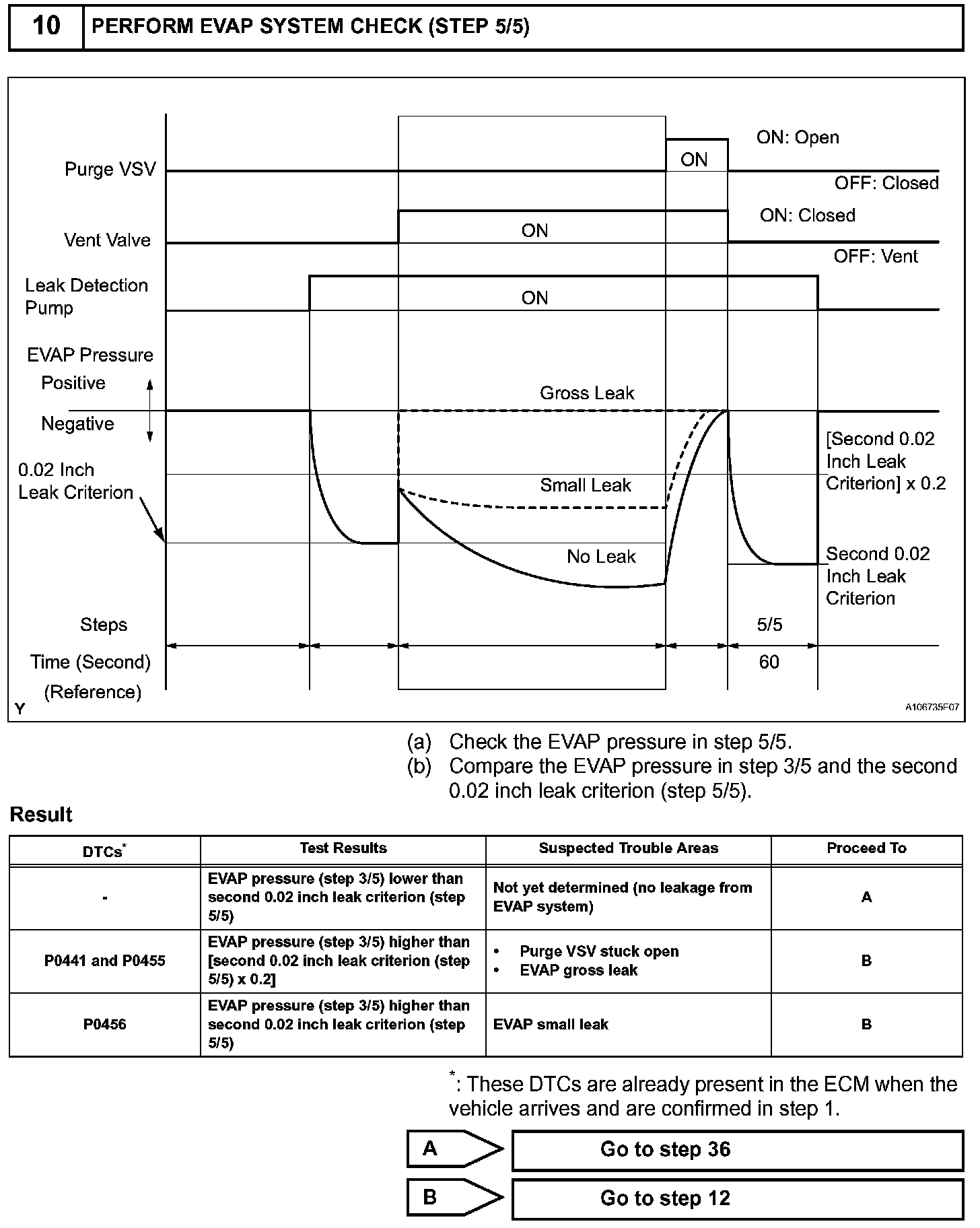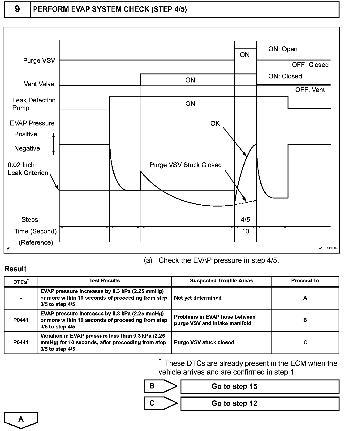 The vent valve is turned OFF (open) and the EVAP pressure is then measured. If the variation in the pressure is less than 0.5 kPa (3.75 mmHg), the ECM interprets this as the purge VSV being stuck closed, and illuminates the MIL and sets DTC P0441 (2 trip detection logic).