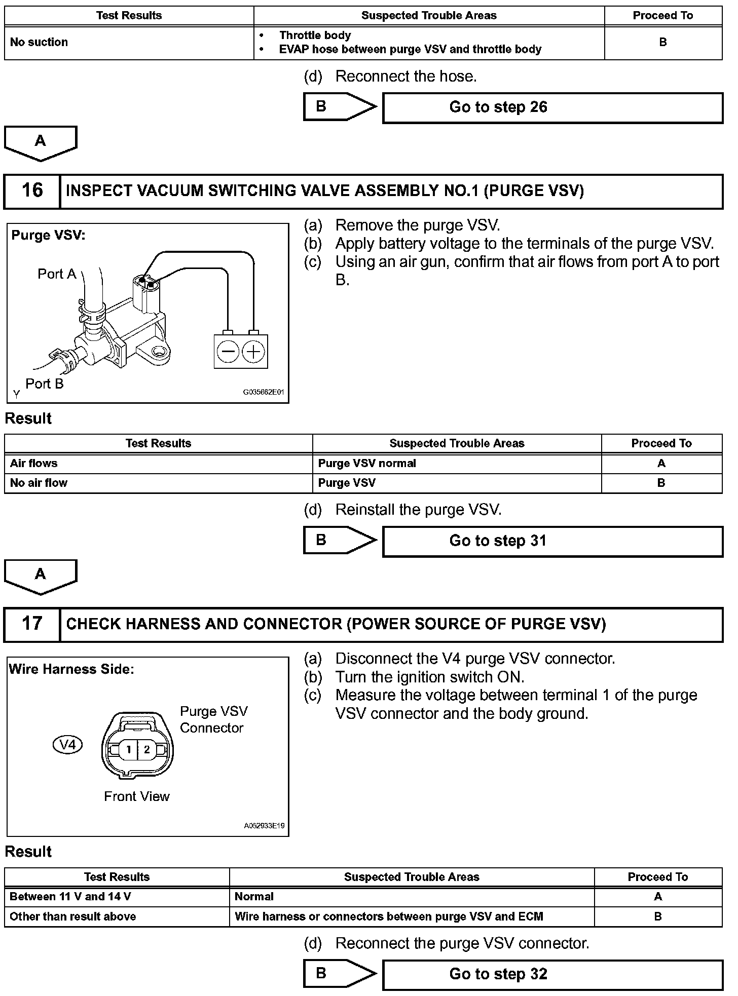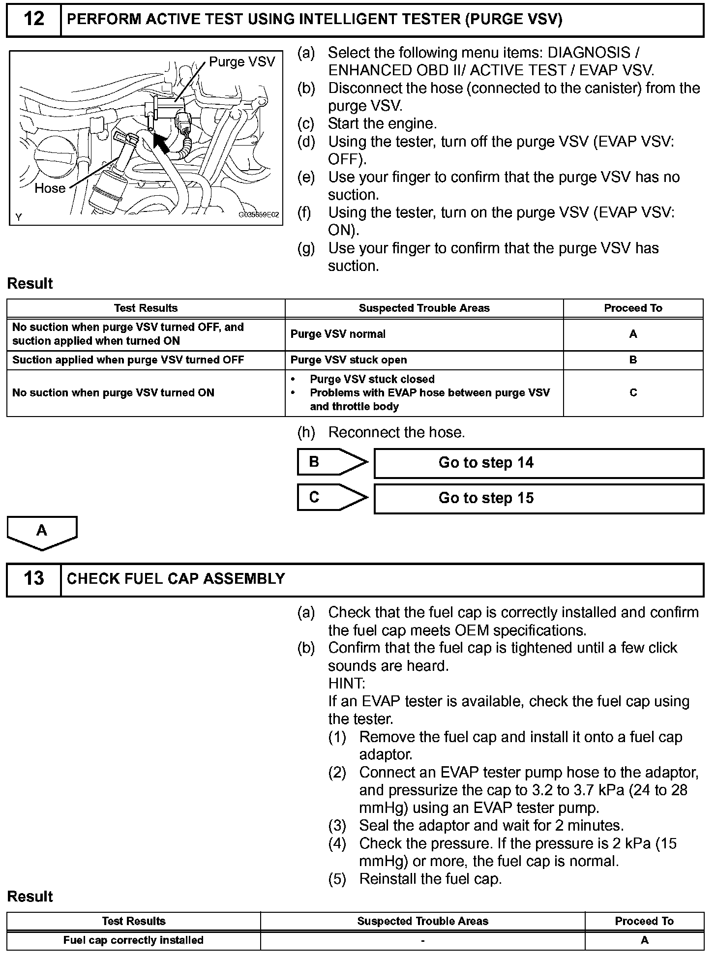 While the engine is running and the purge VSV (Vacuum Switching Valve) is ON (open), the ECM monitors the purge flow by measuring the EVAP pressure change. If negative pressure is not created, the ECM begins the 2nd monitor.