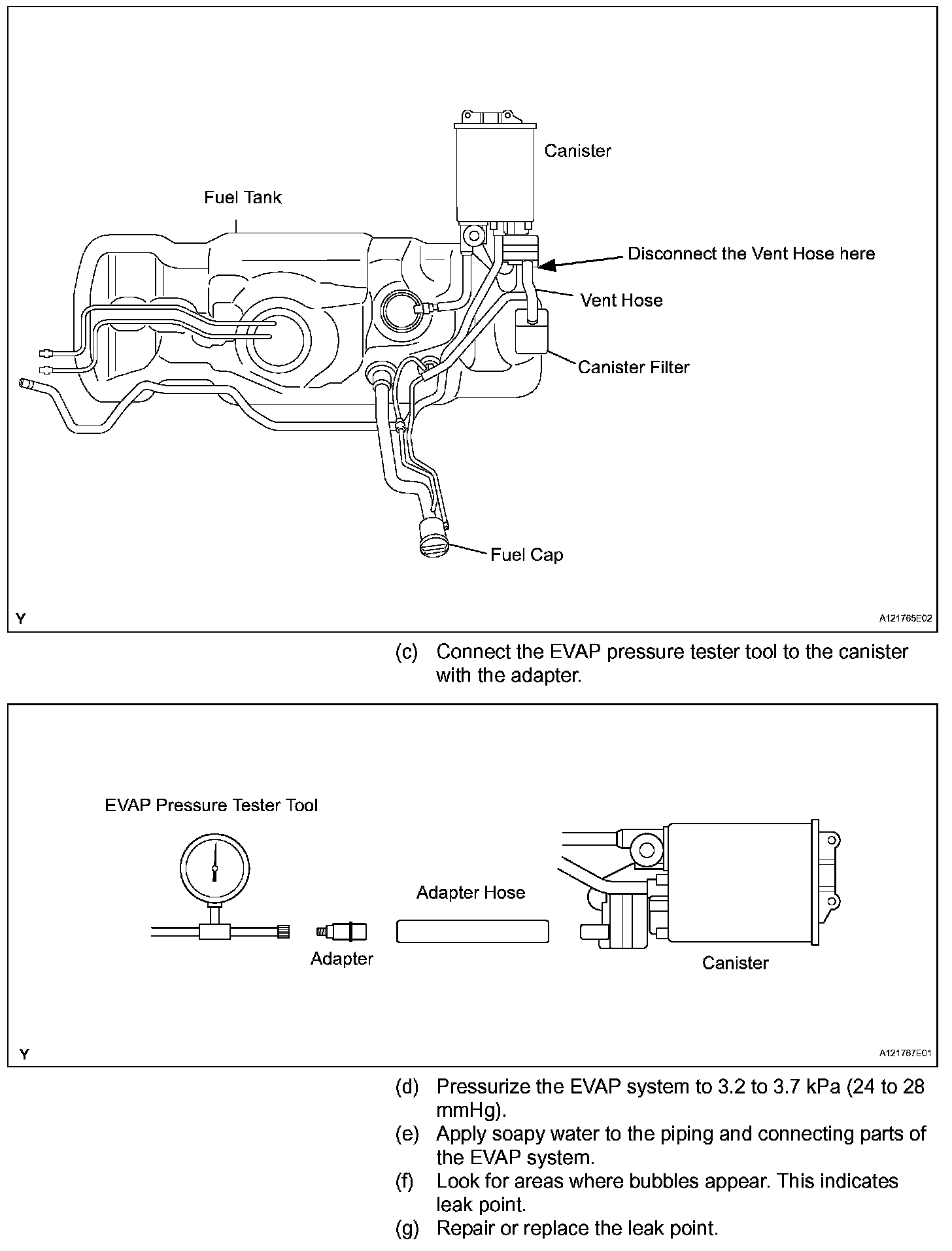 NOTE: In this vehicle's EVAP system, turning ON the vent valve does not seal off the EVAP system. To check for leaks in the EVAP system, disconnect the air inlet vent hose and apply pressure from the atmosphere side of the canister.