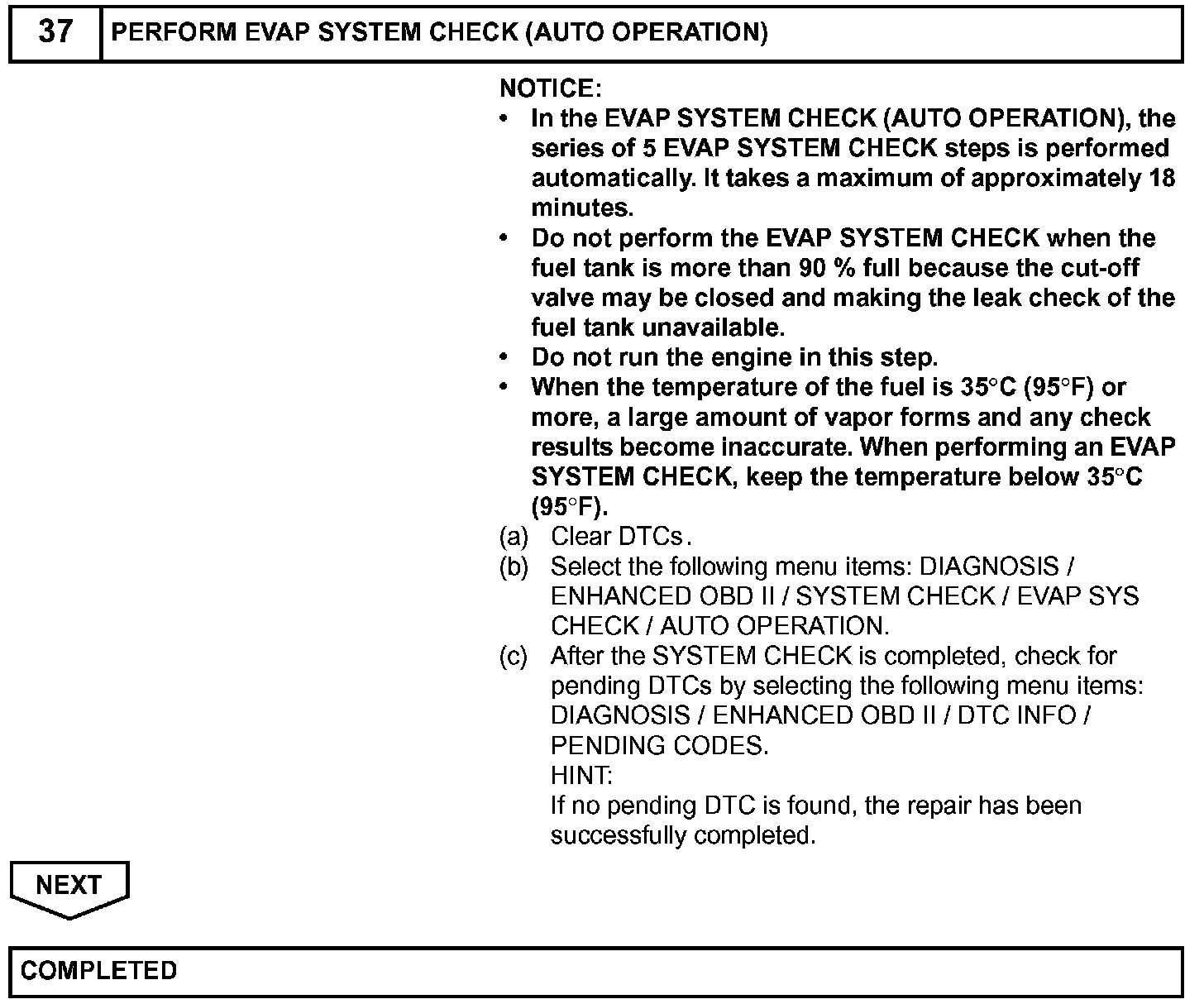 HINT: *: If the engine coolant temperature is not below 35 degree C (95 degree F) 5 hours after the ignition switch is turned off, the monitor check starts 2 hours later. If it is still not below 35 degree C (95 degree F) 7 hours after the ignition switch is turned off, the monitor check starts 2.5 hours later.