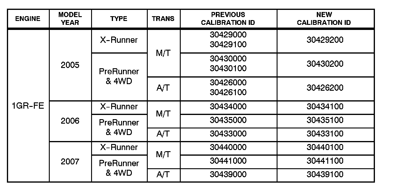 Some 2005 - 2007 model year Tacoma vehicles equipped with a 1GR-FE engine may exhibit an intermittent ~no start" condition. Improvements have been made to the Engine Control Module/ECM (SAE term: Powertrain Control Module/PCM) calibration to reduce the possibility of this condition occurring. Please use the following procedure to update the calibration.