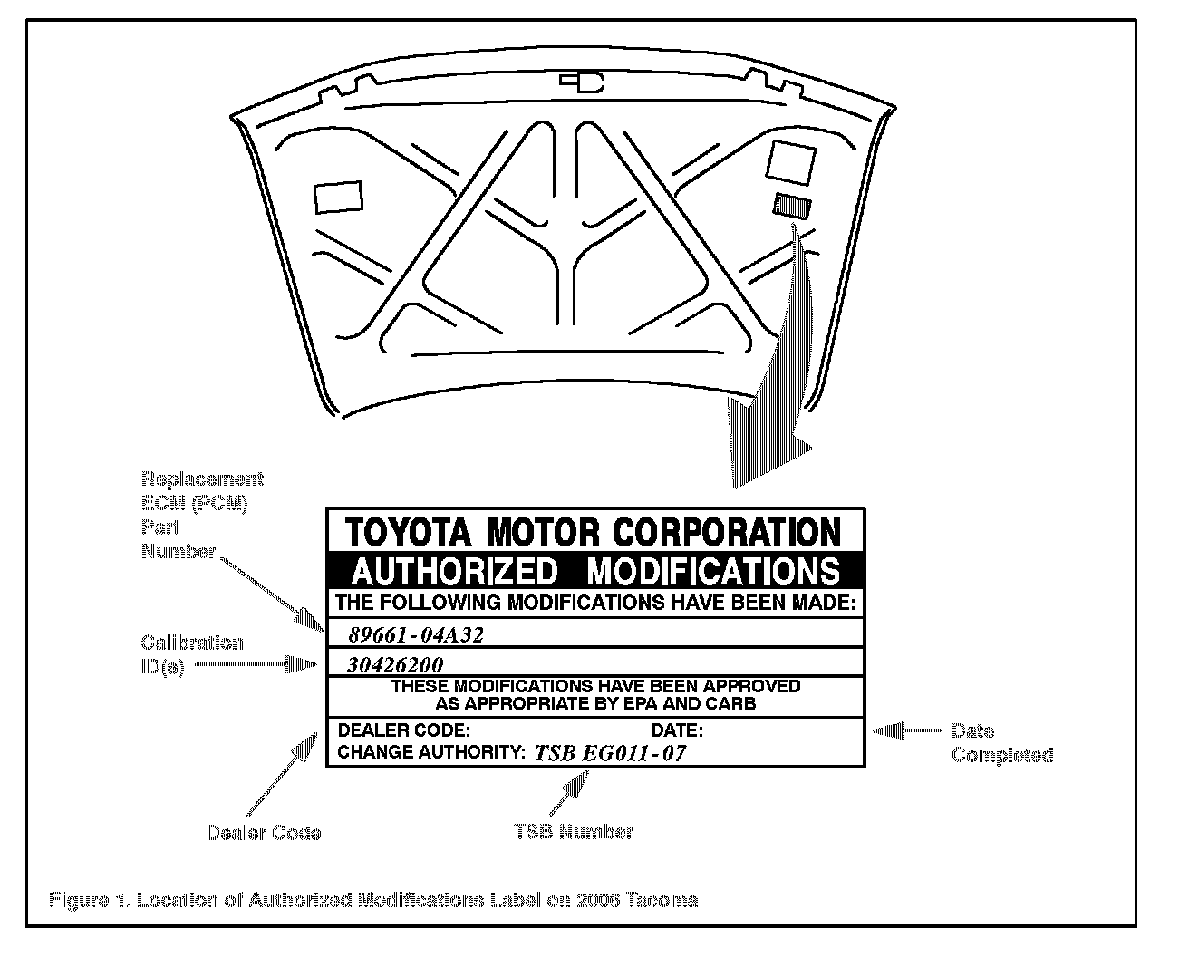 1. Check for the Authorized Modifications Label affixed to the vehicle in the location shown in Figure 1. Confirm if the ECM (PCM) calibration has been updated. If the calibration listed is NOT the latest ECM (PCM) calibration go to step 2.