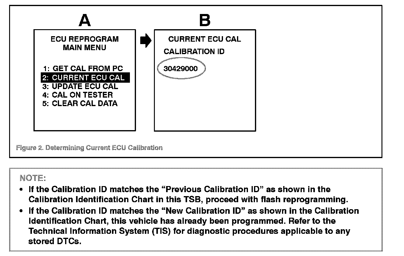 2. Connect the Diagnostic Tester to the vehicle and select CURRENT ECU CAL from the ECU REPROGRAM MAIN MENU. Determine the vehicle's current ECU calibrations (see Figure 2).