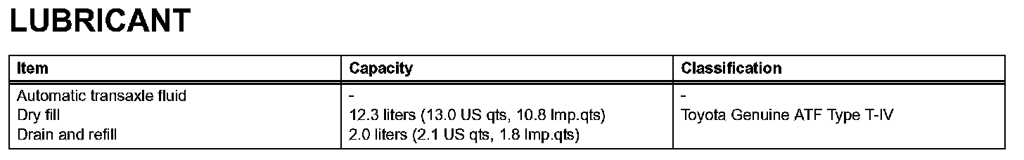 Notice: Using automatic transmission fluid other than "Toyota Genuine ATF Type T-IV" may cause deterioration in shift quality, locking up of your transmission accompanied by vibration, and ultimately damage the automatic transmission of your vehicle.