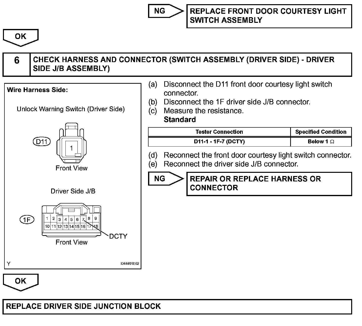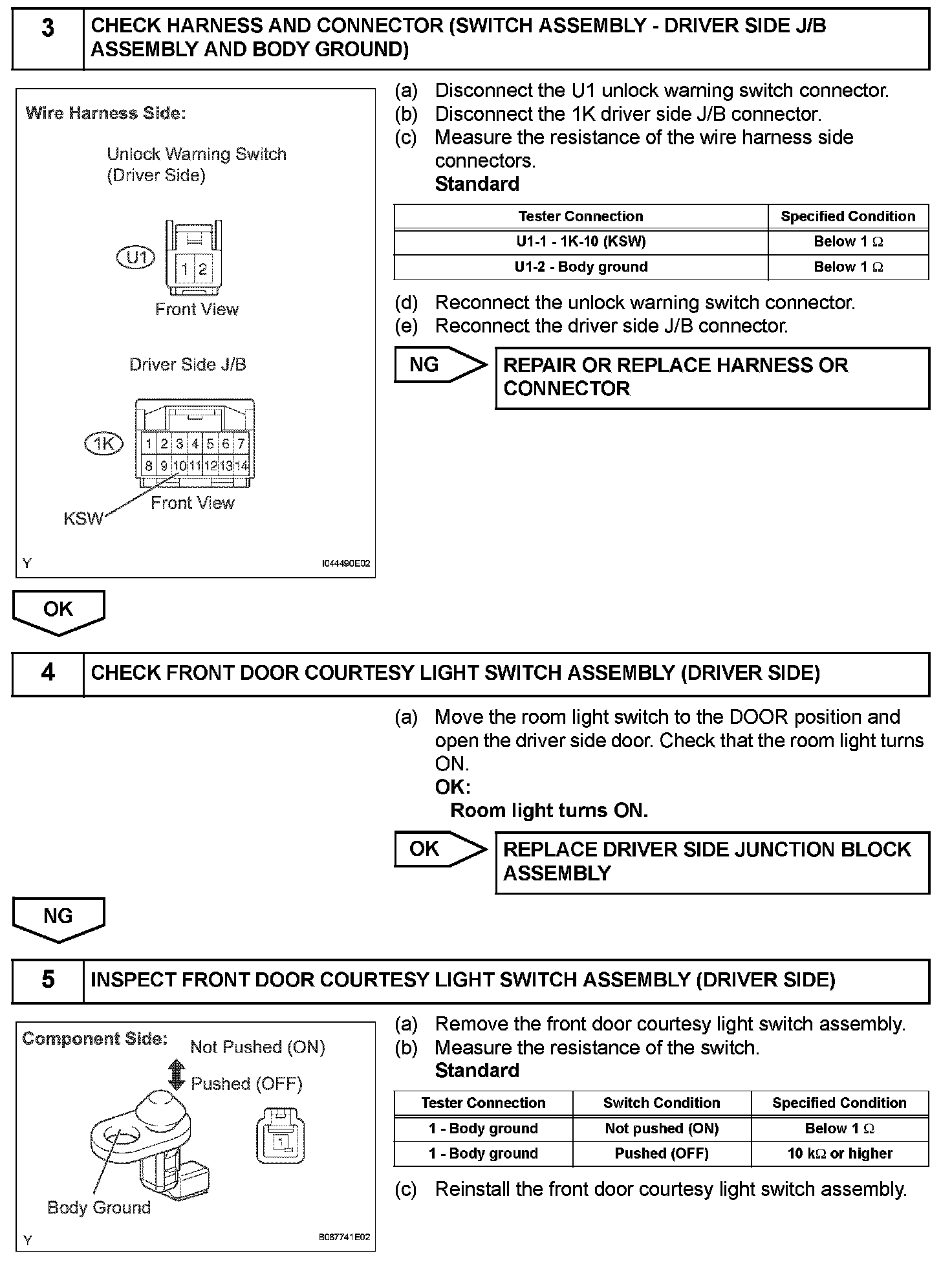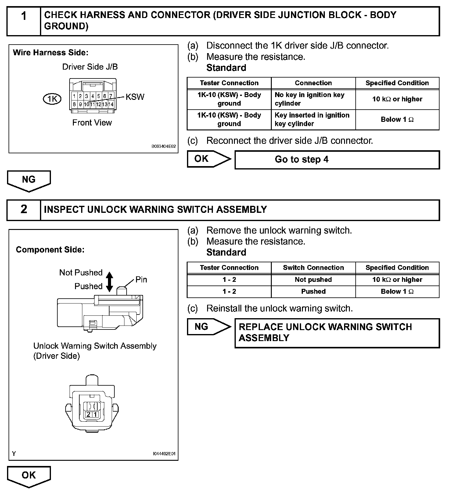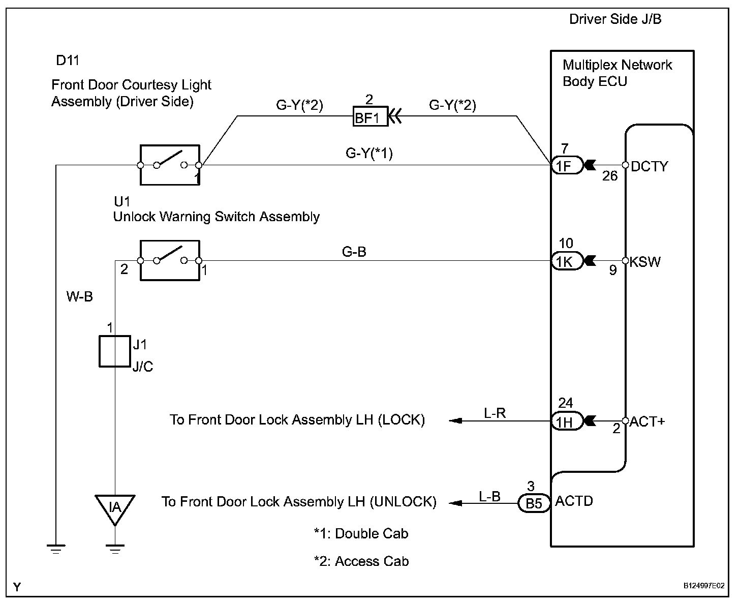 To prevent the key from being locked in the vehicle, the multiplex network body ECU prevents the doors from being locked by monitoring 2 switches: 1) the unlock warning switch, which turns ON when the key is inserted into the ignition key cylinder; and 2) the driver side courtesy light switch, which turns ON when the driver side door is opened.