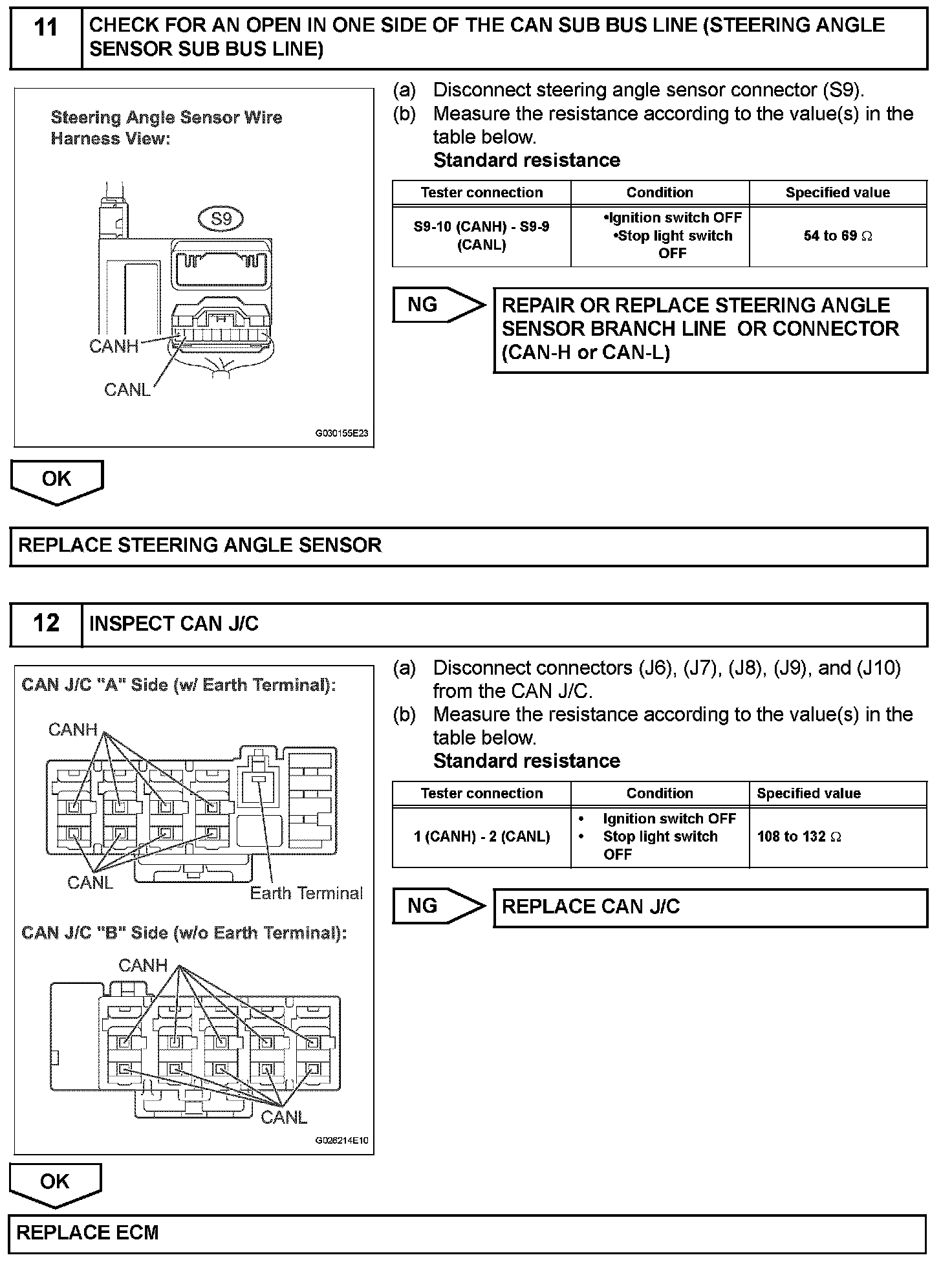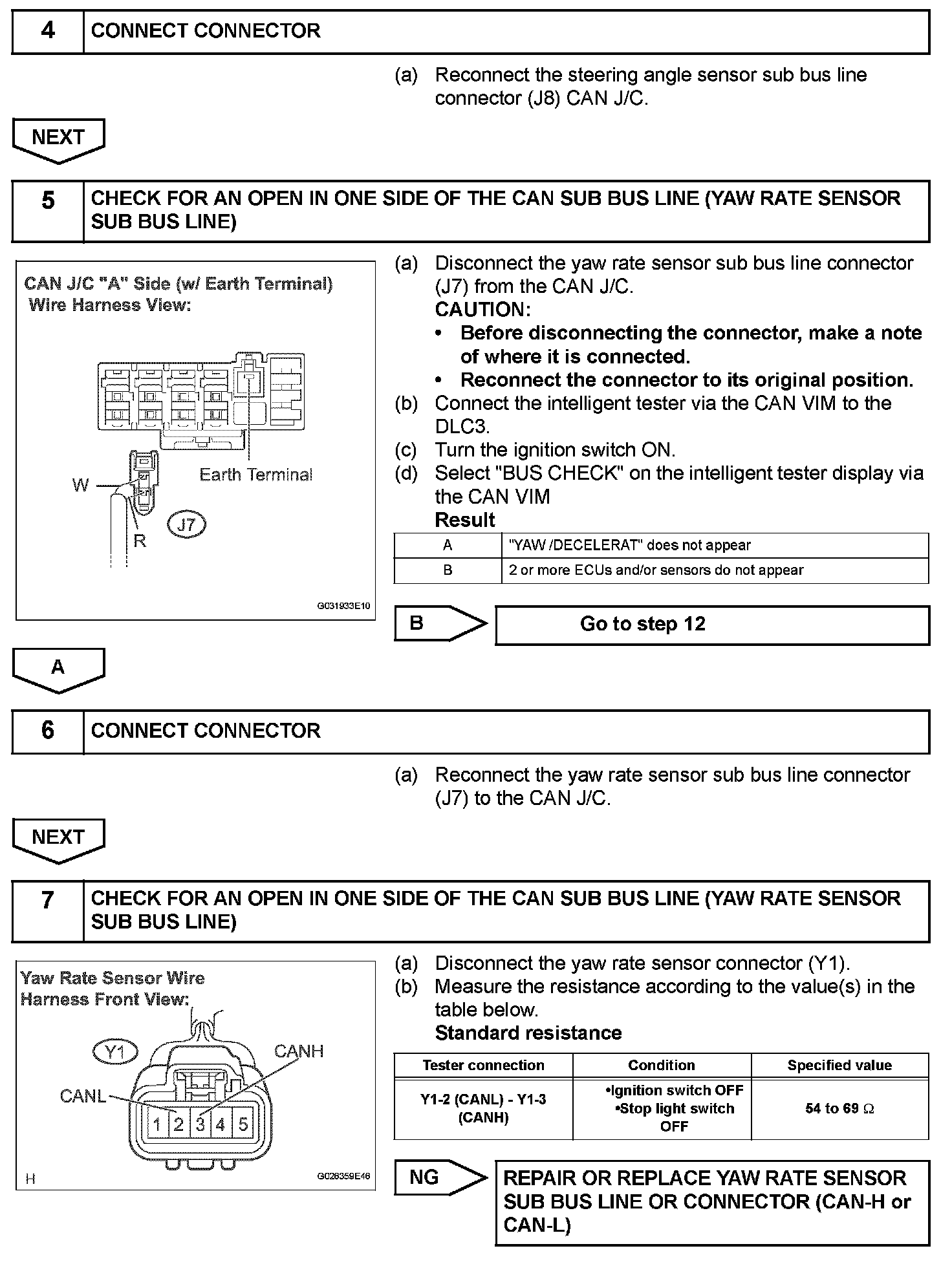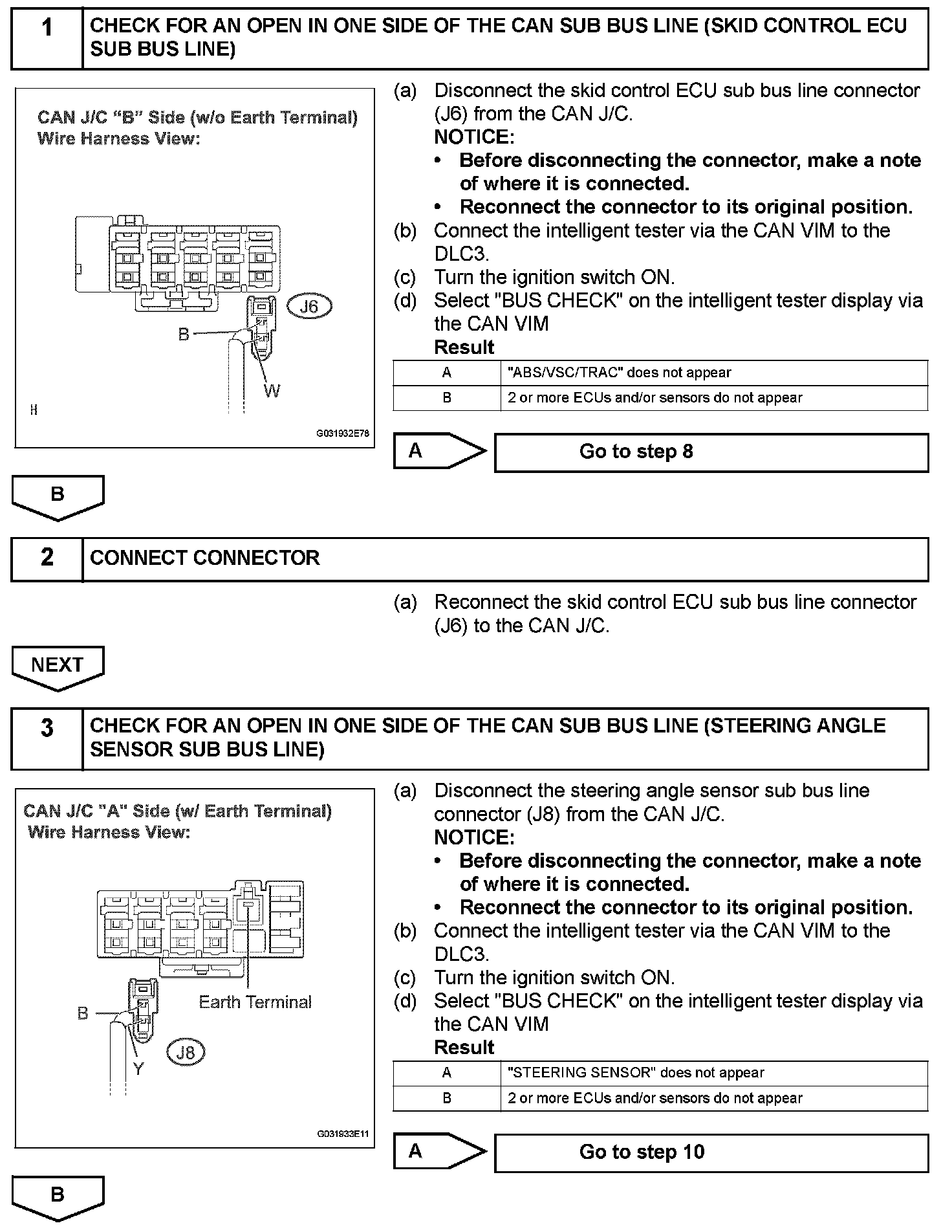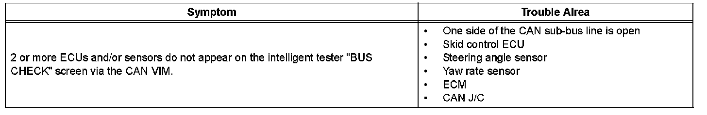 If 2 or more ECUs and/or sensors do not appear on the intelligent tester "BUS CHECK" screen via the CAN VIM, one side of the CAN sub-bus line may be open. (ONE side of the CAN-H [sub-bus line] / CAN-L [sub-bus line] of the ECU and/or sensor is open.)