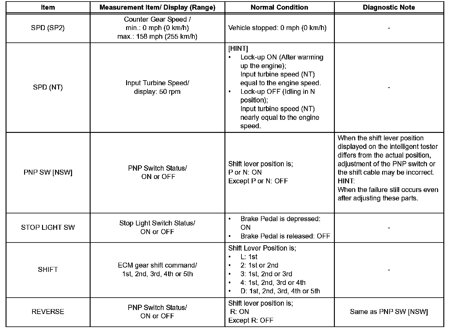 HINT: According to the DATA LIST displayed on the intelligent tester, you can read the values of components, such as the switches, sensors and actuators, without removing any parts. Reading the DATA LIST as a first step of troubleshooting is one method of shortening labor time.