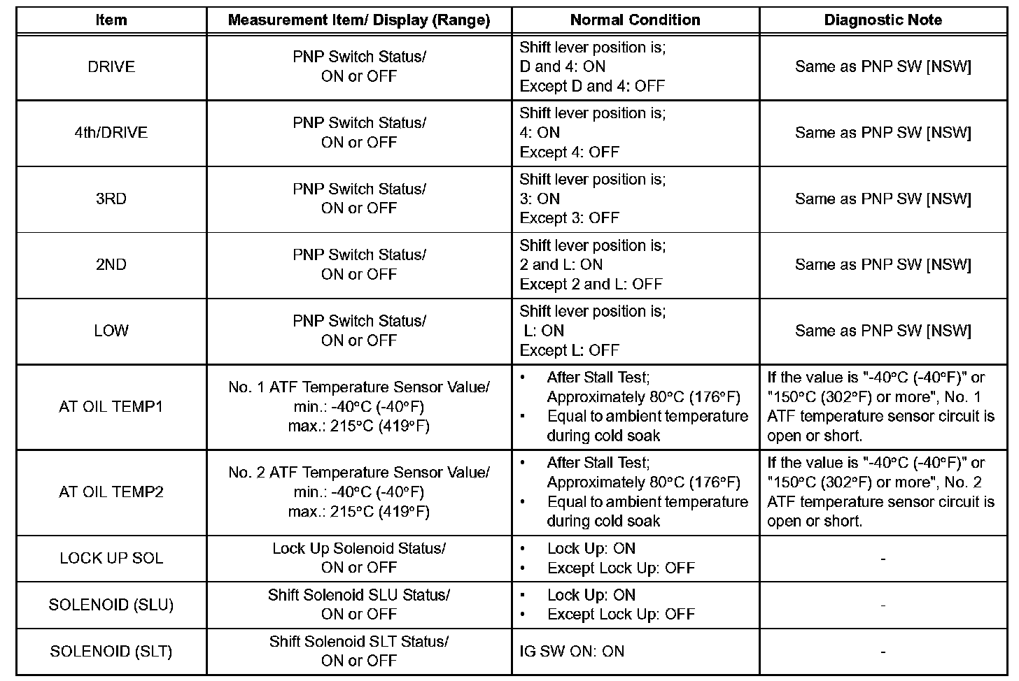 NOTICE: In the table, the values listed under "Normal Condition" are for reference only. Do not depend solely on these reference values when judging whether a part is faulty or not.