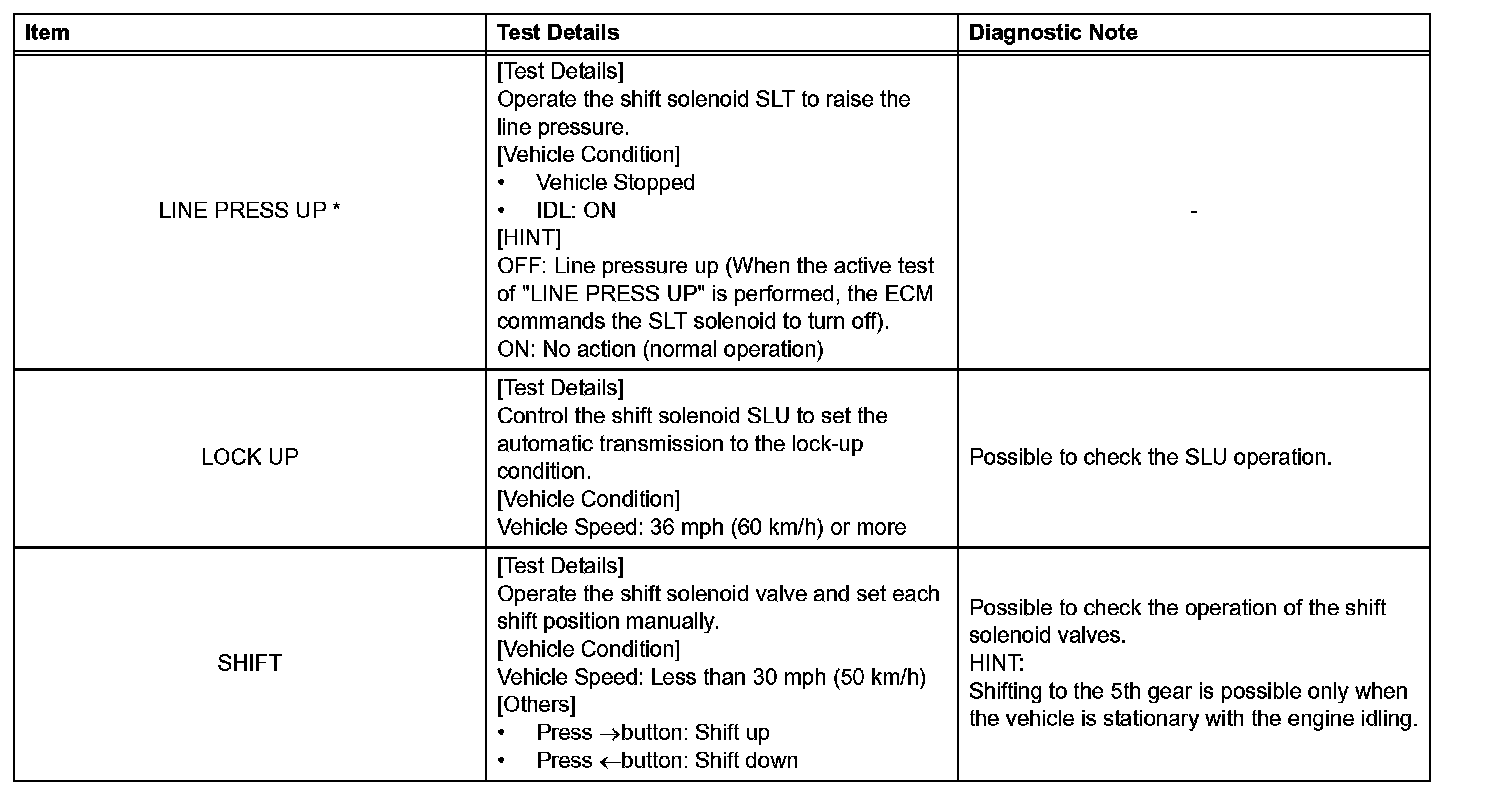 "LINE PRESS UP" in the ACTIVE TEST is performed to check the line pressure changes by connecting SST to the automatic transmission, which is used in the HYDRAULIC TEST as well. Hydraulic Test