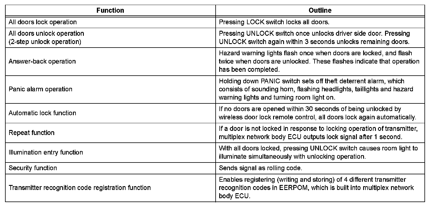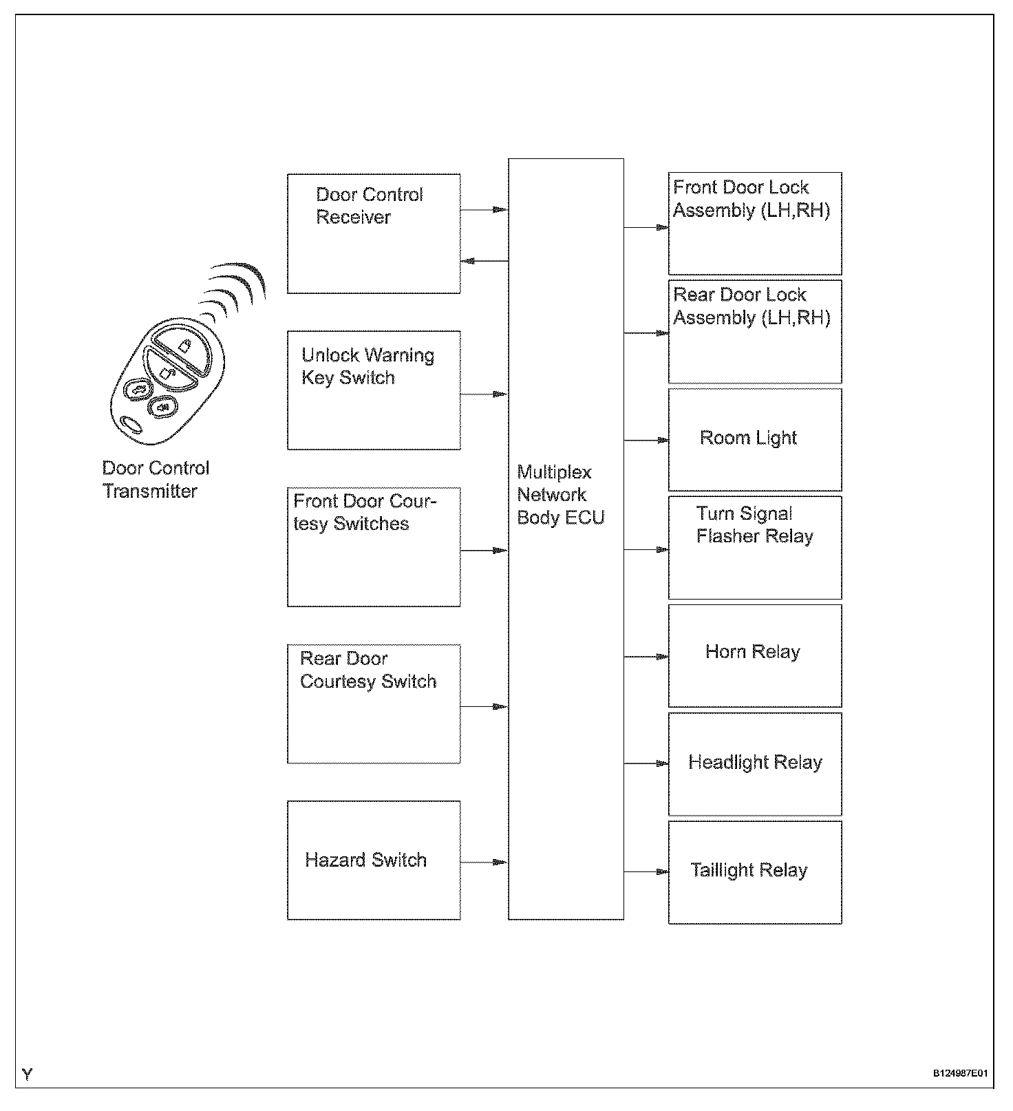 - The door control receiver performs the code identification process and the multiplex network body ECU operates the door lock control. A serial data link is provided for communication between the door control receiver and the multiplex network body ECU.