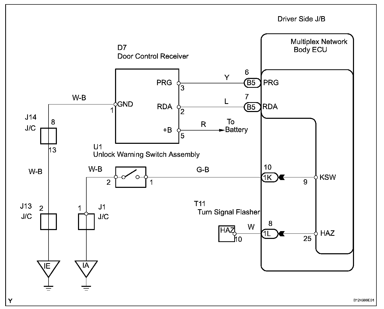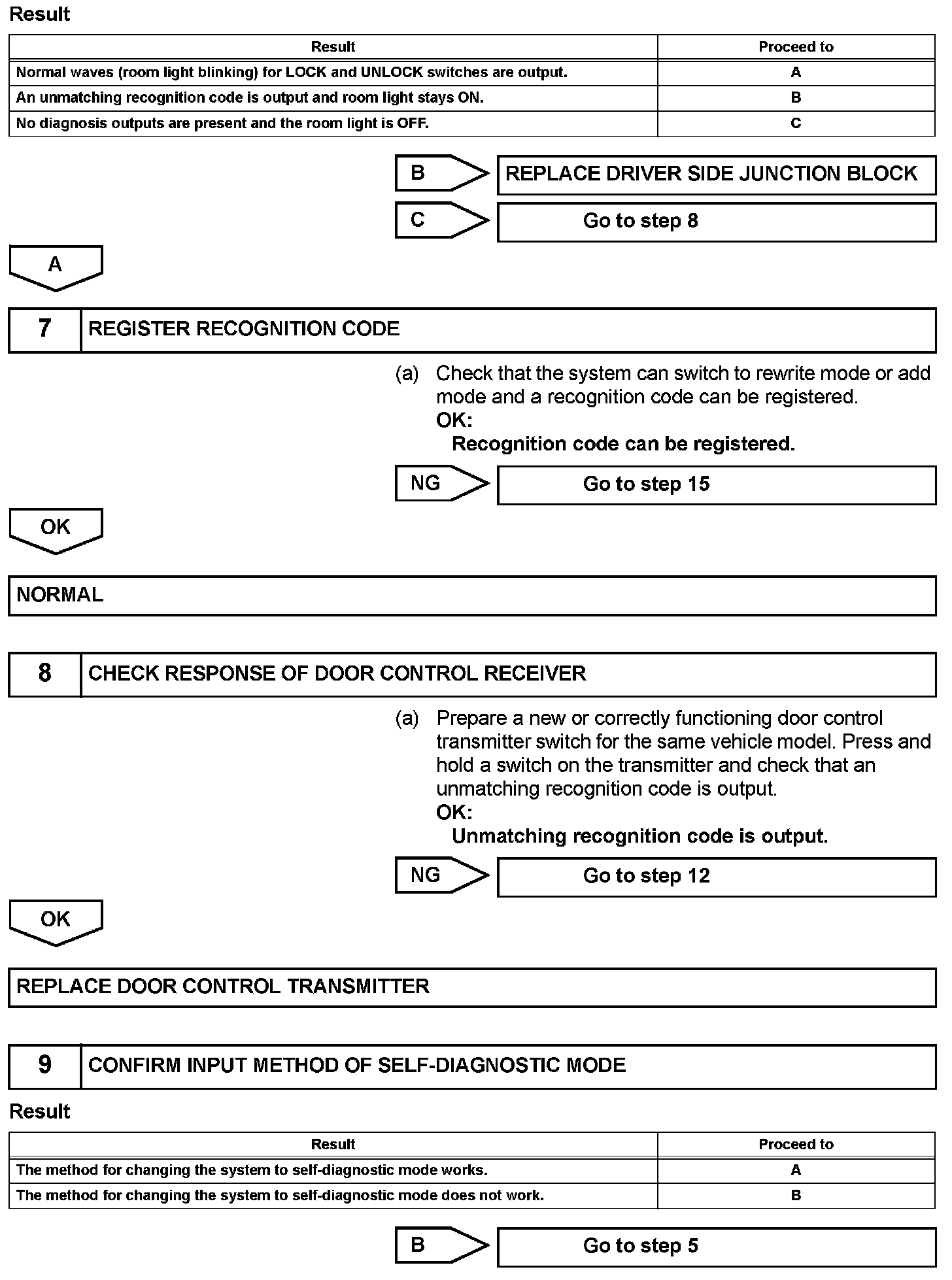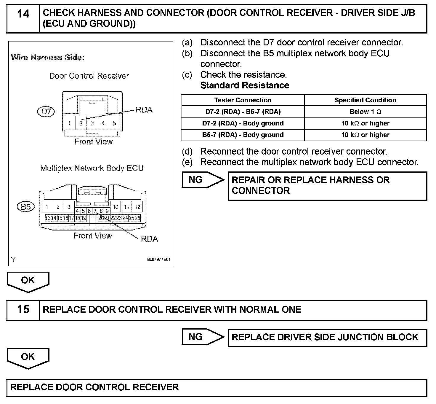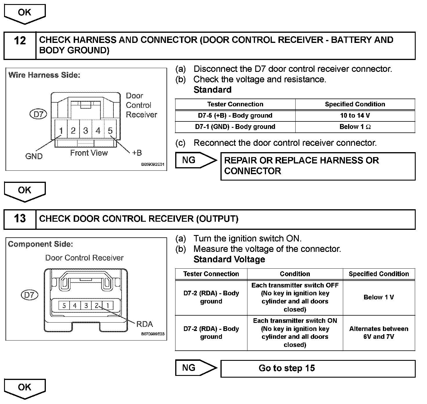 The door control receiver receives signals from the transmitter and sends these signals to the multiplex network body ECU. The multiplex network body ECU then controls the door operation by sending LOCK/ UNLOCK signals to the appropriate door lock actuator.