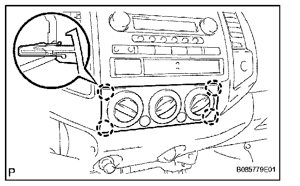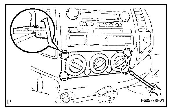 a. Using a screwdriver, disengage the 4 clips and remove the air conditioner control assembly.