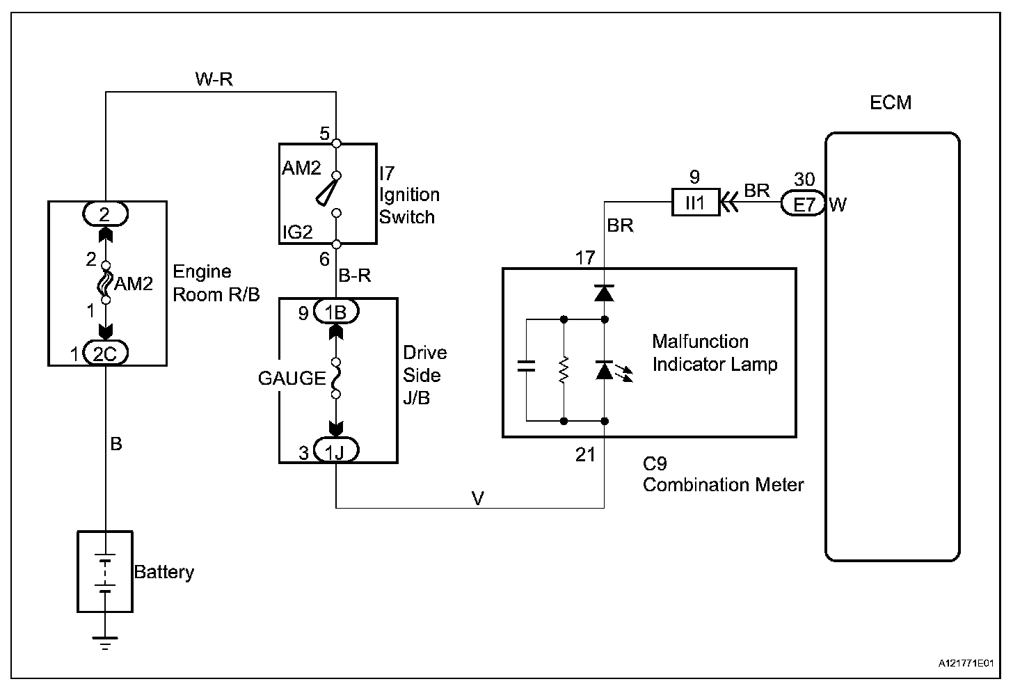 By turning the ignition switch to ON, power is supplied to the MIL circuit, and the ECM provides the circuit ground which illuminates the MIL.