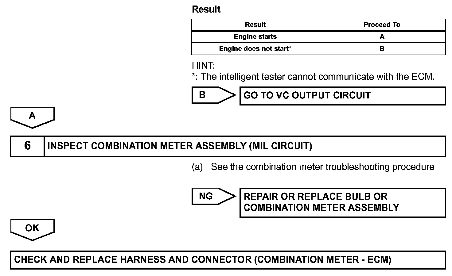 The MIL operation can be checked visually: When the ignition switch is first turned to ON, the MIL should be illuminated and should then turn OFF. If the MIL remains illuminated or is not illuminated, conduct the following troubleshooting procedure using an intelligent tester.