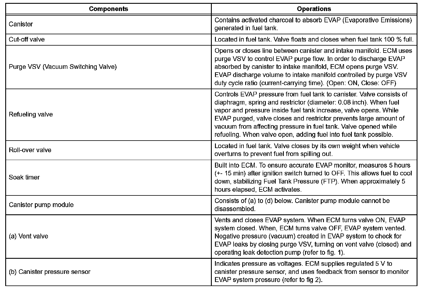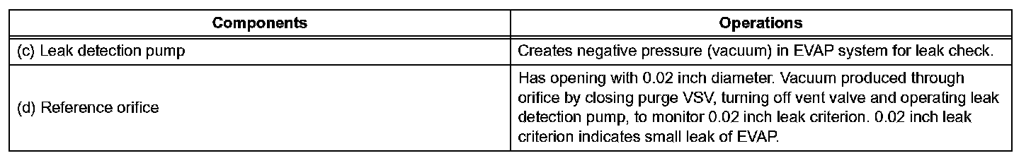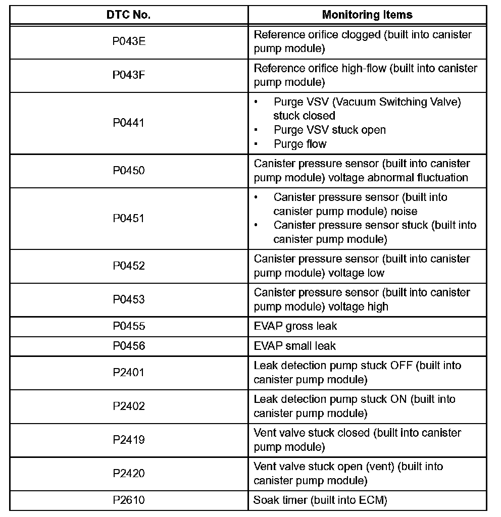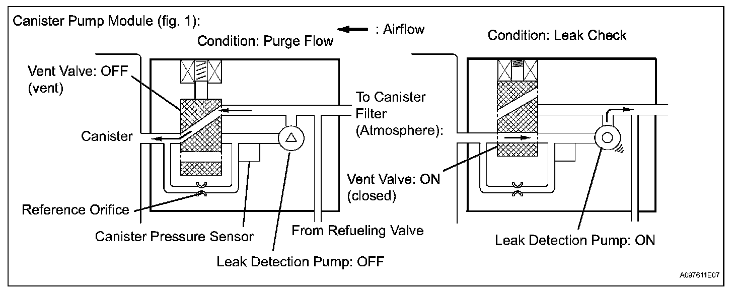 The leak detection pump creates negative pressure (vacuum) in the EVAP system and the pressure is measured. Finally, the ECM monitors for leaks from the EVAP system, and malfunctions in both the canister pump module and purge VSV, based on the EVAP pressure.
