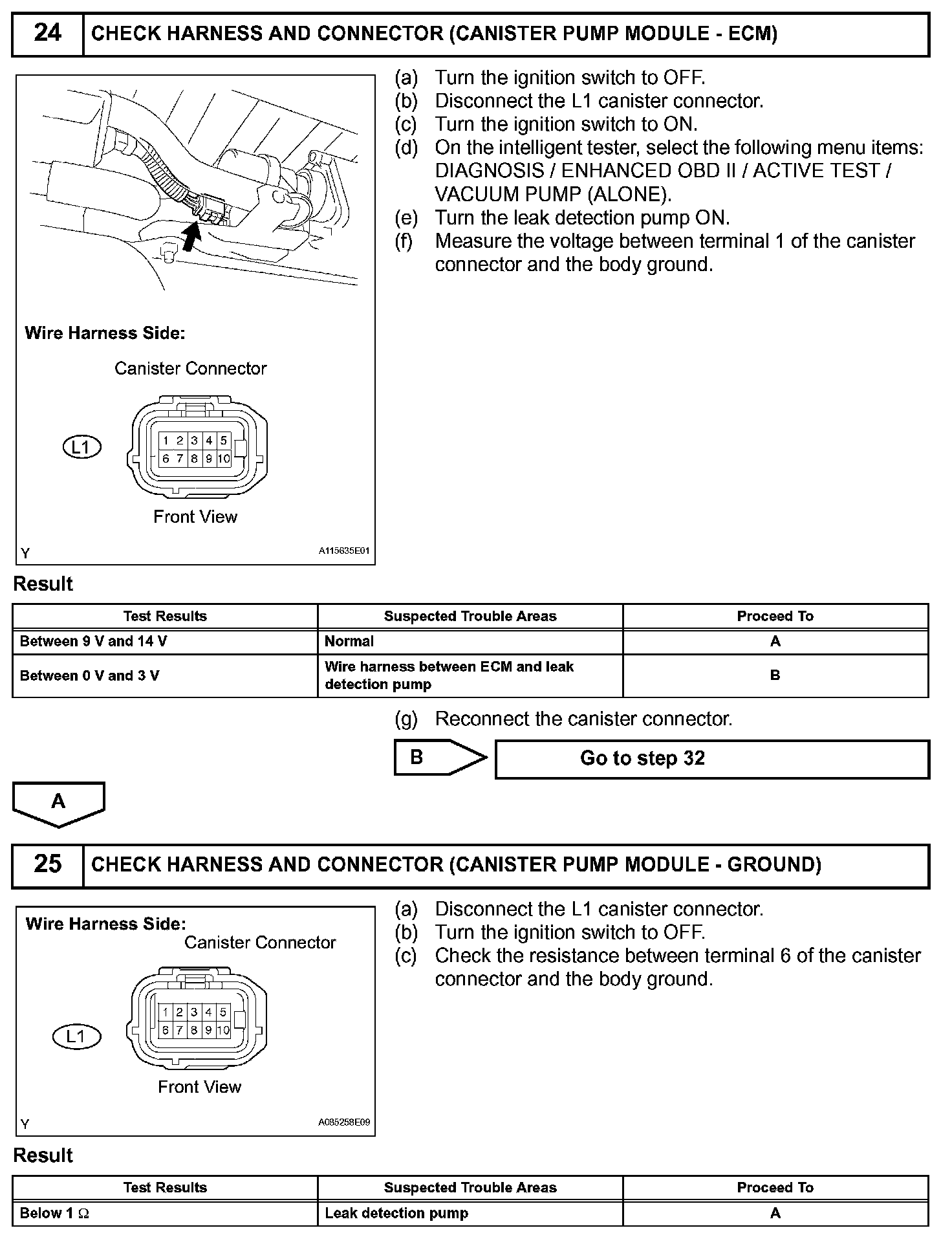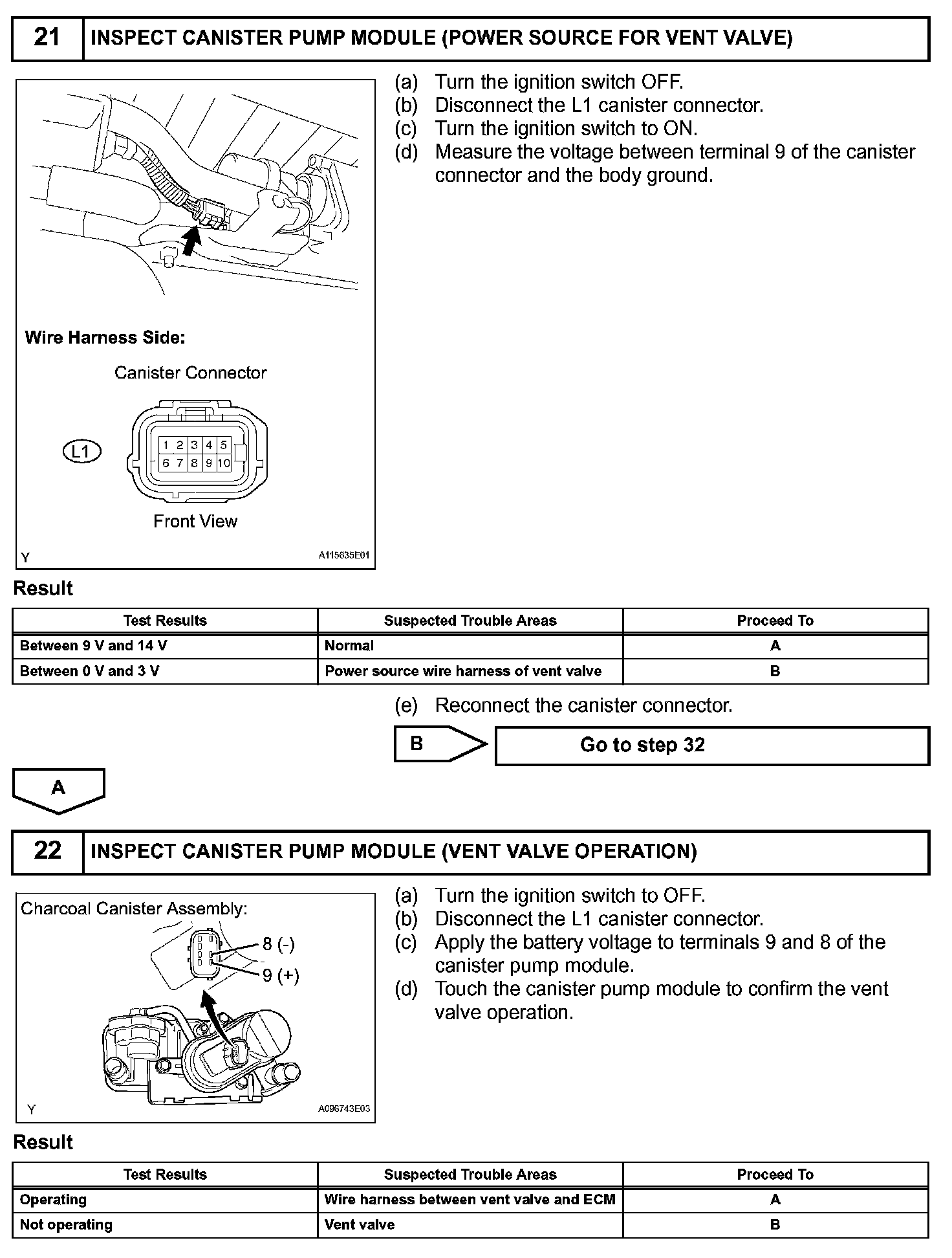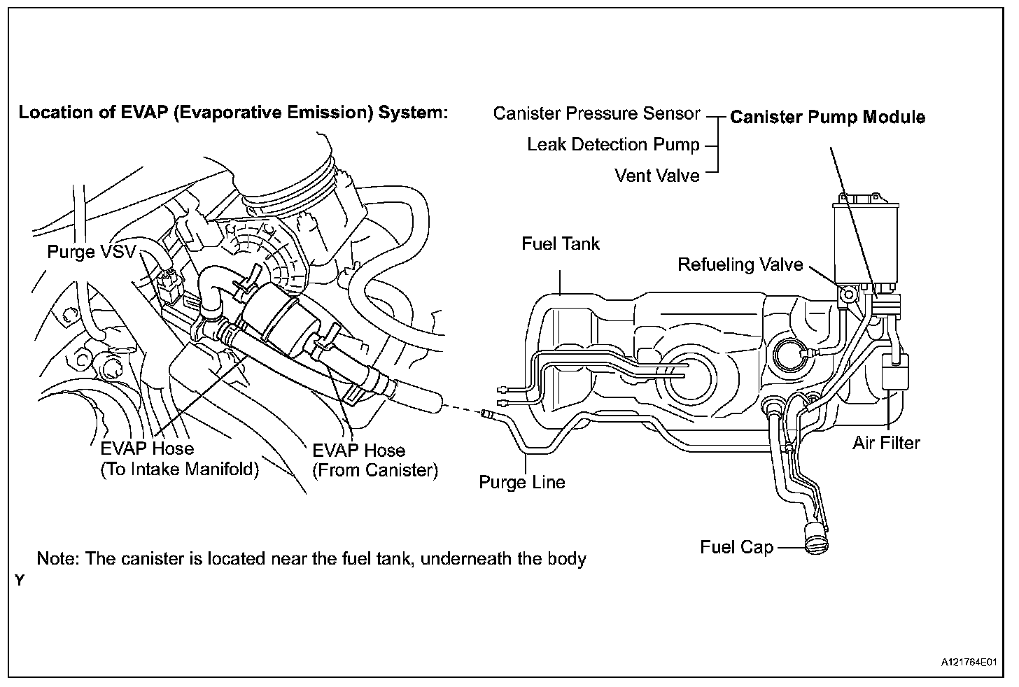 The leak detection pump creates negative pressure (vacuum) in the EVAP system and the pressure is measured. Finally, the ECM monitors for leaks from the EVAP system, and malfunctions in both the canister pump module and purge VSV, based on the EVAP pressure.