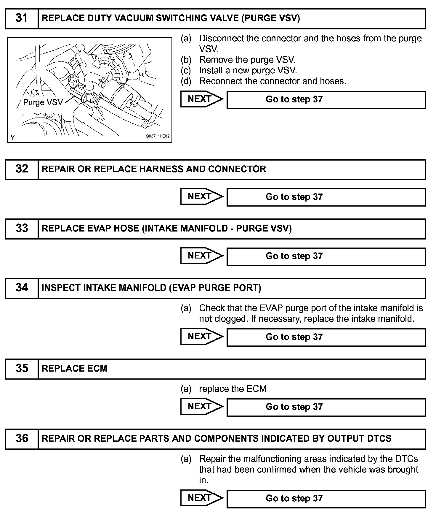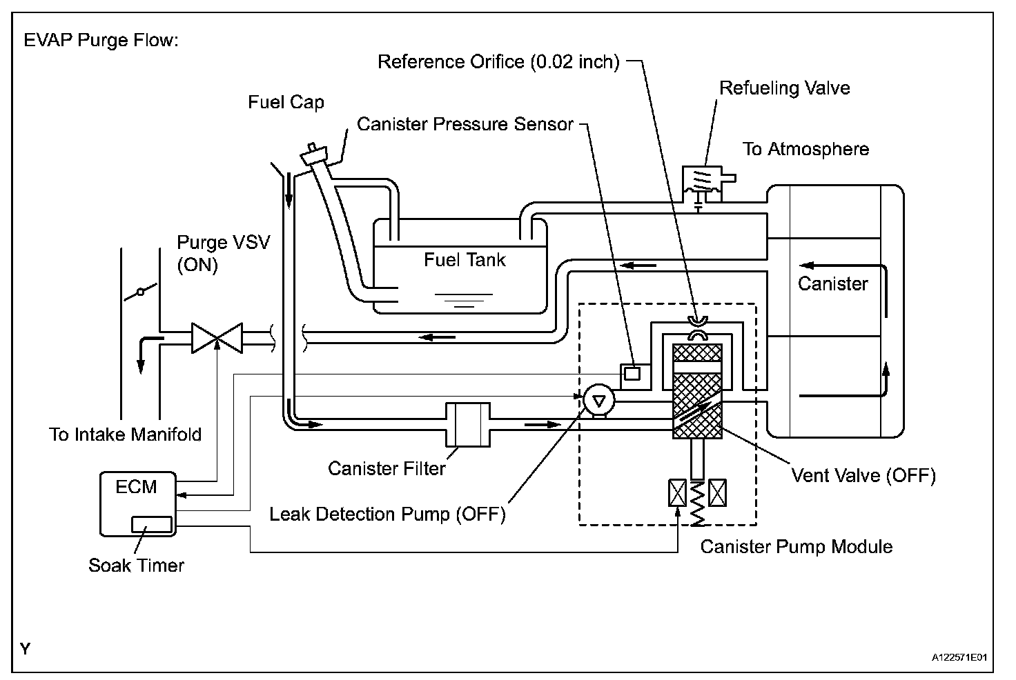 While the engine is running, if a predetermined condition (closed-loop etc.) is met, the purge VSV is opened by the ECM and stored fuel vapors in the canister are purged to the intake manifold. The ECM changes the duty cycle ratio of the purge VSV to control purge flow volume.