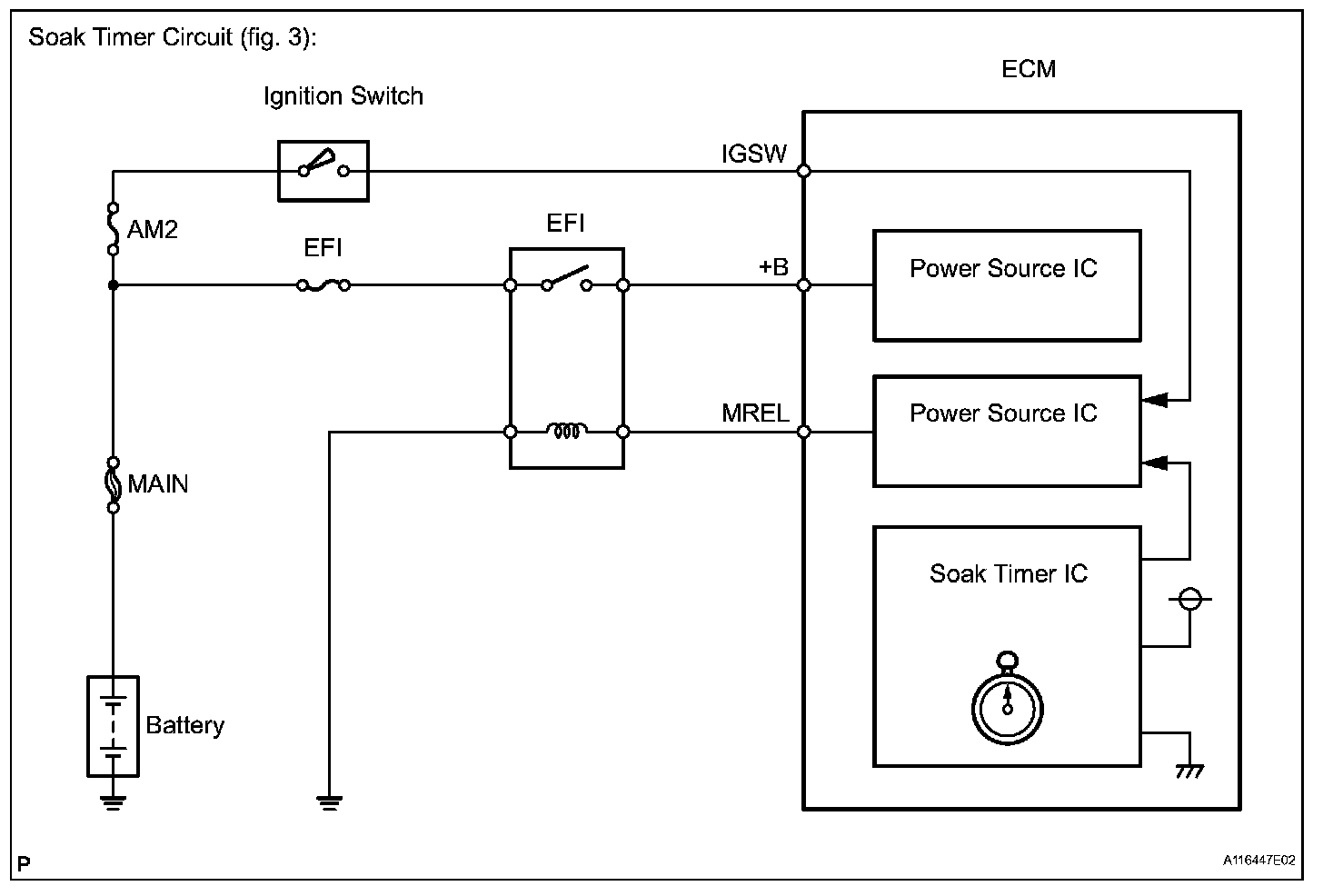 The vent valve is turned OFF (open) and the EVAP pressure is then measured. If the variation in the pressure is less than 0.5 kPa (3.75 mmHg), the ECM interprets this as the purge VSV being stuck closed, and illuminates the MIL and sets DTC P0441 (2 trip detection logic).