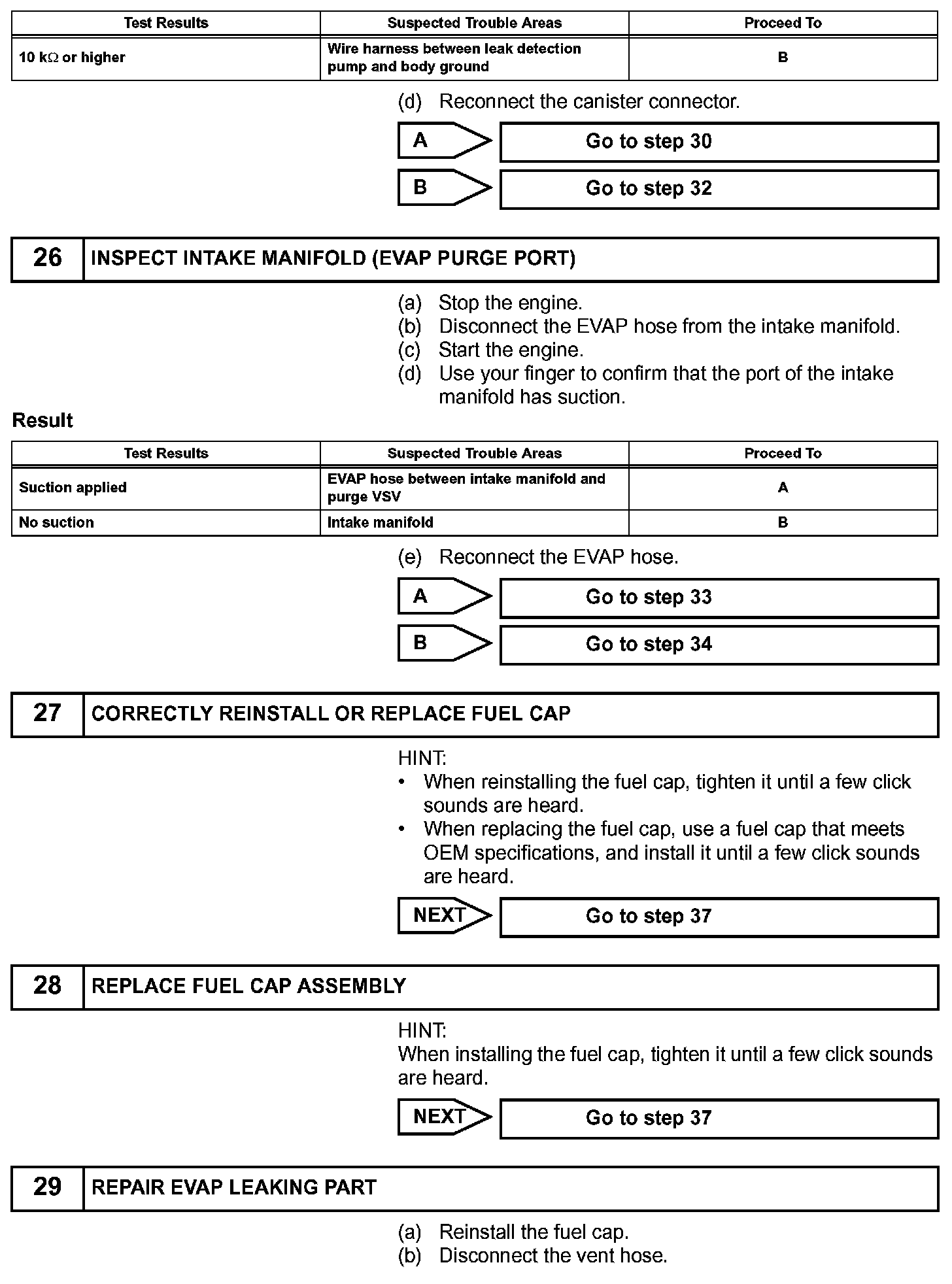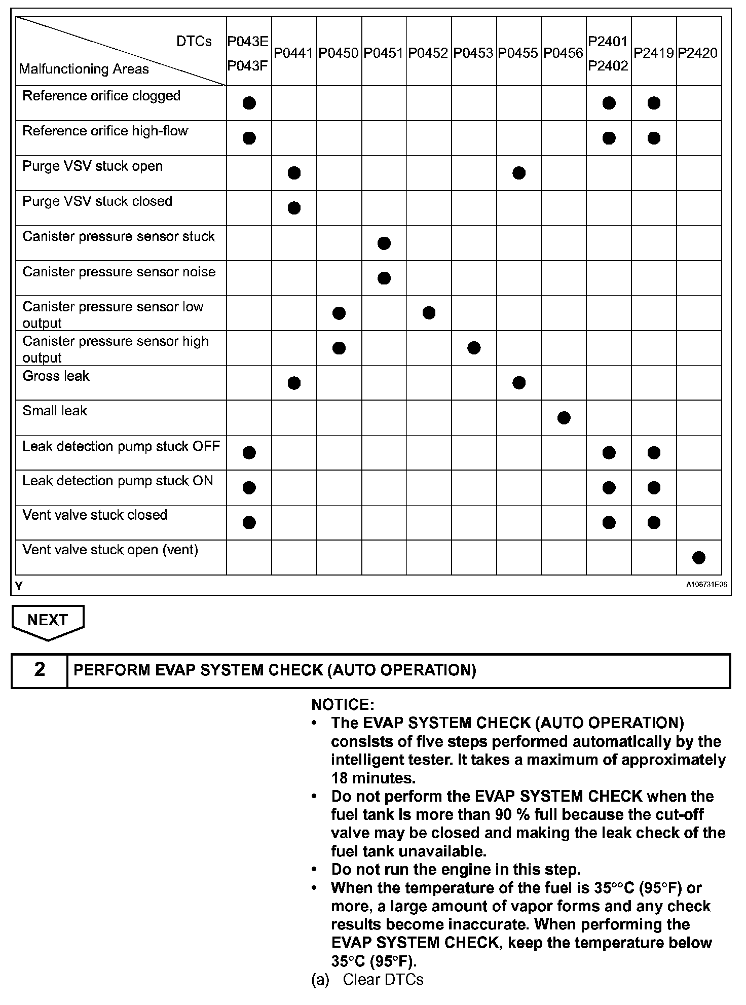 If any EVAP system DTCs are set, the malfunctioning area can be determined using the table given.