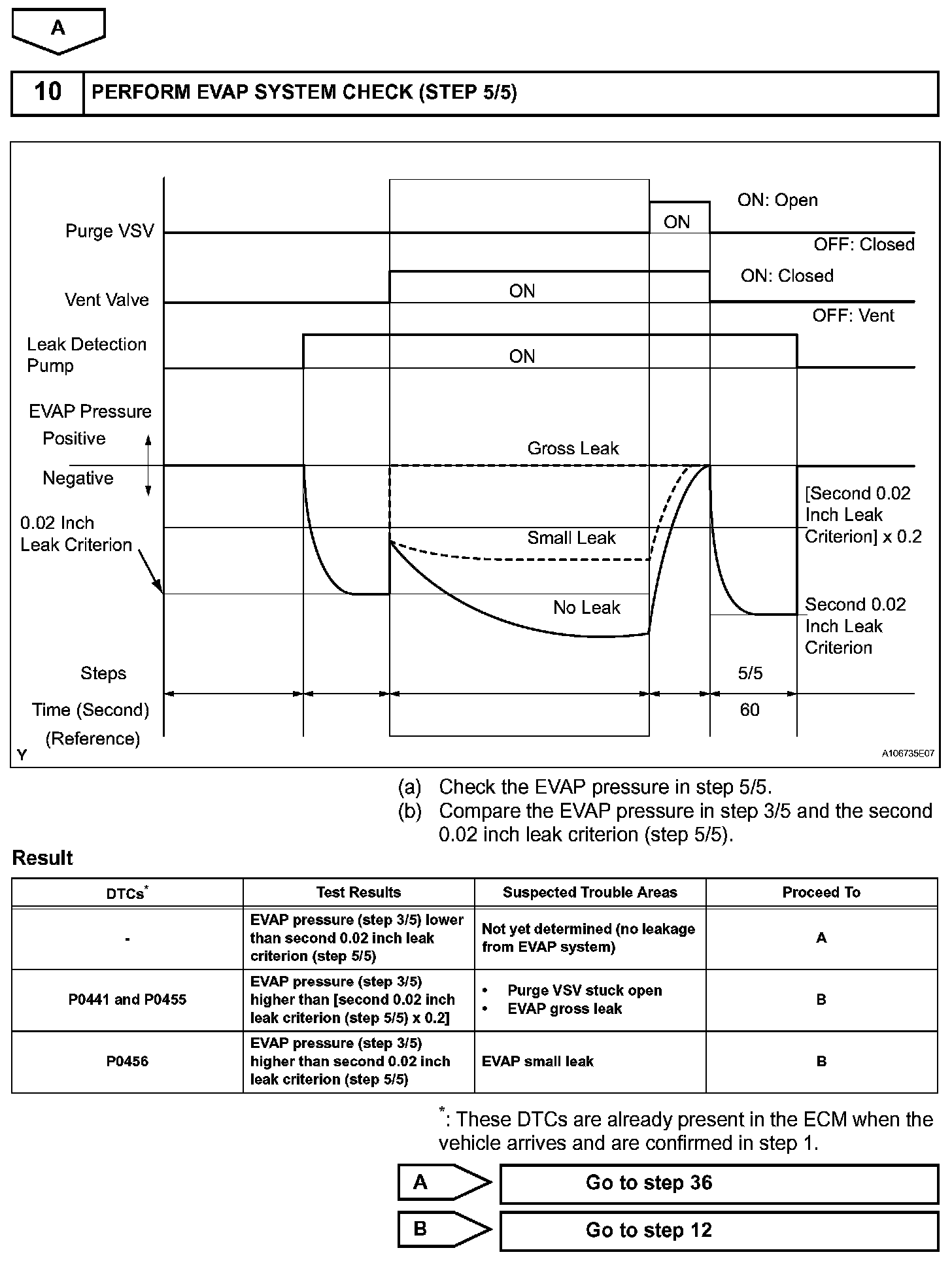 NOTE: If the 0.02 inch leak criterion difference between the first and second checks is greater than the specification, the DTCs corresponding to the leak criterion (P043E, P043F, P2401, P2402 and P2419) will be all stored.