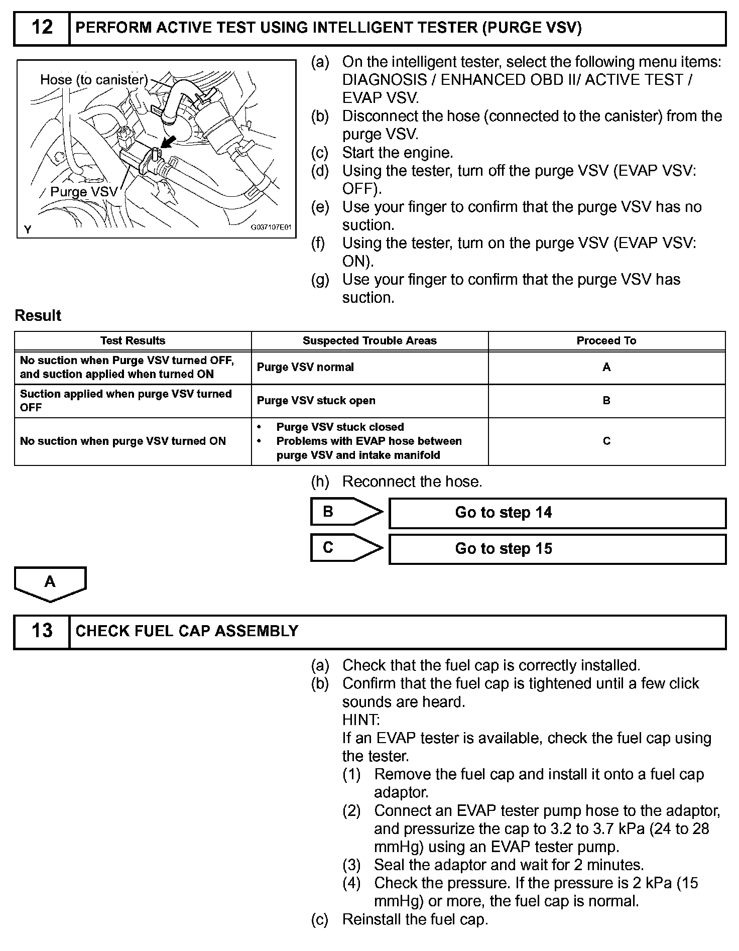While the engine is running and the purge VSV (Vacuum Switching Valve) is ON (open), the ECM monitors the purge flow by measuring the EVAP pressure change. If negative pressure is not created, the ECM begins the 2nd monitor.
