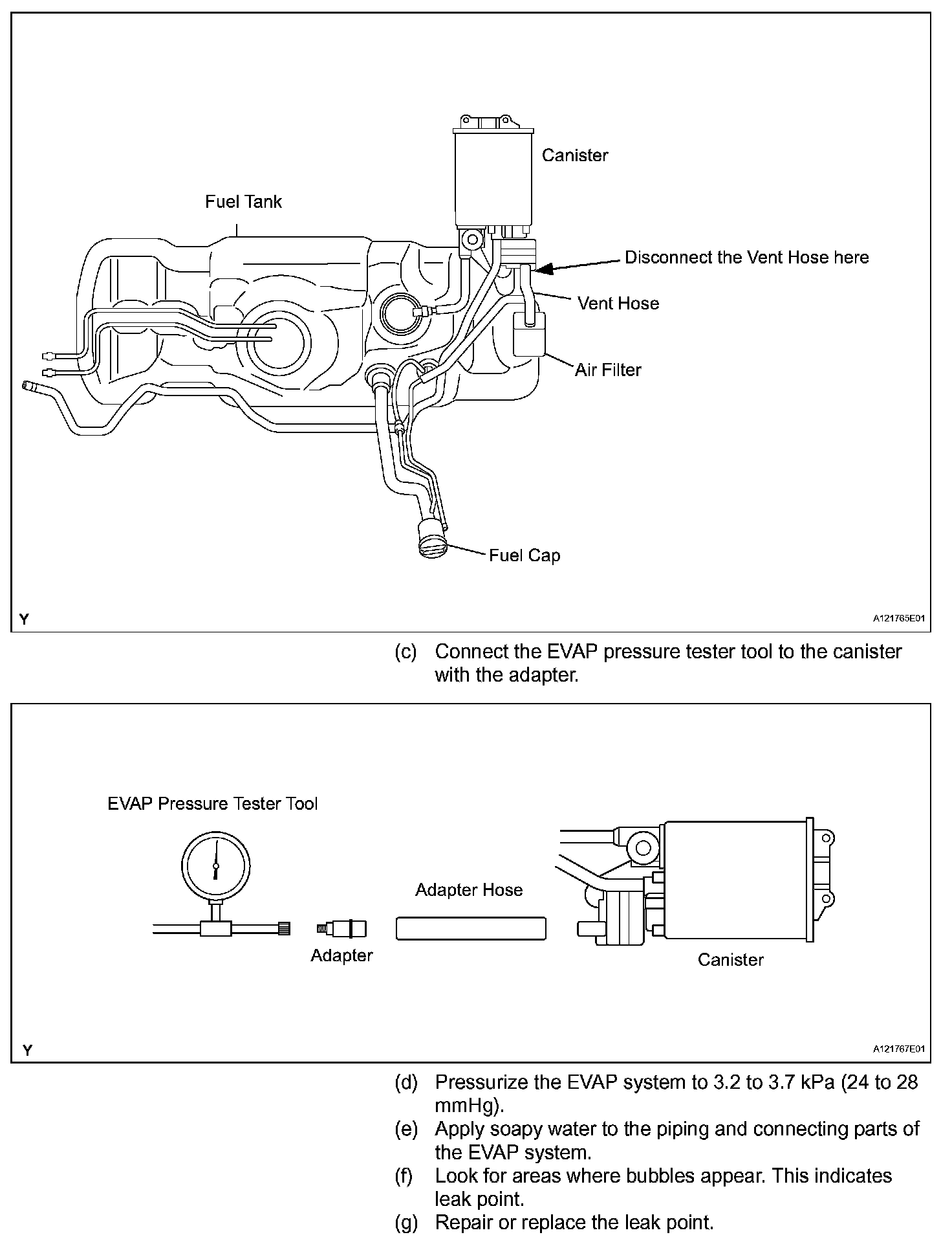 NOTE: In this vehicle's EVAP system, turning ON the vent valve does not seal off the EVAP system. To check for leaks in the EVAP system, disconnect the air inlet vent hose and apply pressure from the atmosphere side of the canister.