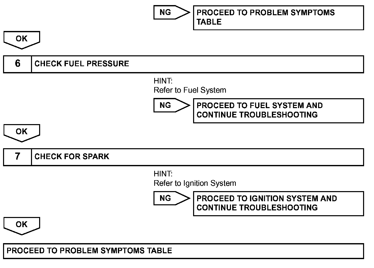 When a malfunction is not confirmed by the DTC check, troubleshooting should be carried out in all circuits considered to be possible causes of the problem. In many cases, by carrying out the basic engine check shown in the flowchart, the location of the problem can be found quickly and efficiently. Therefore, using this check is essential when engine troubleshooting.