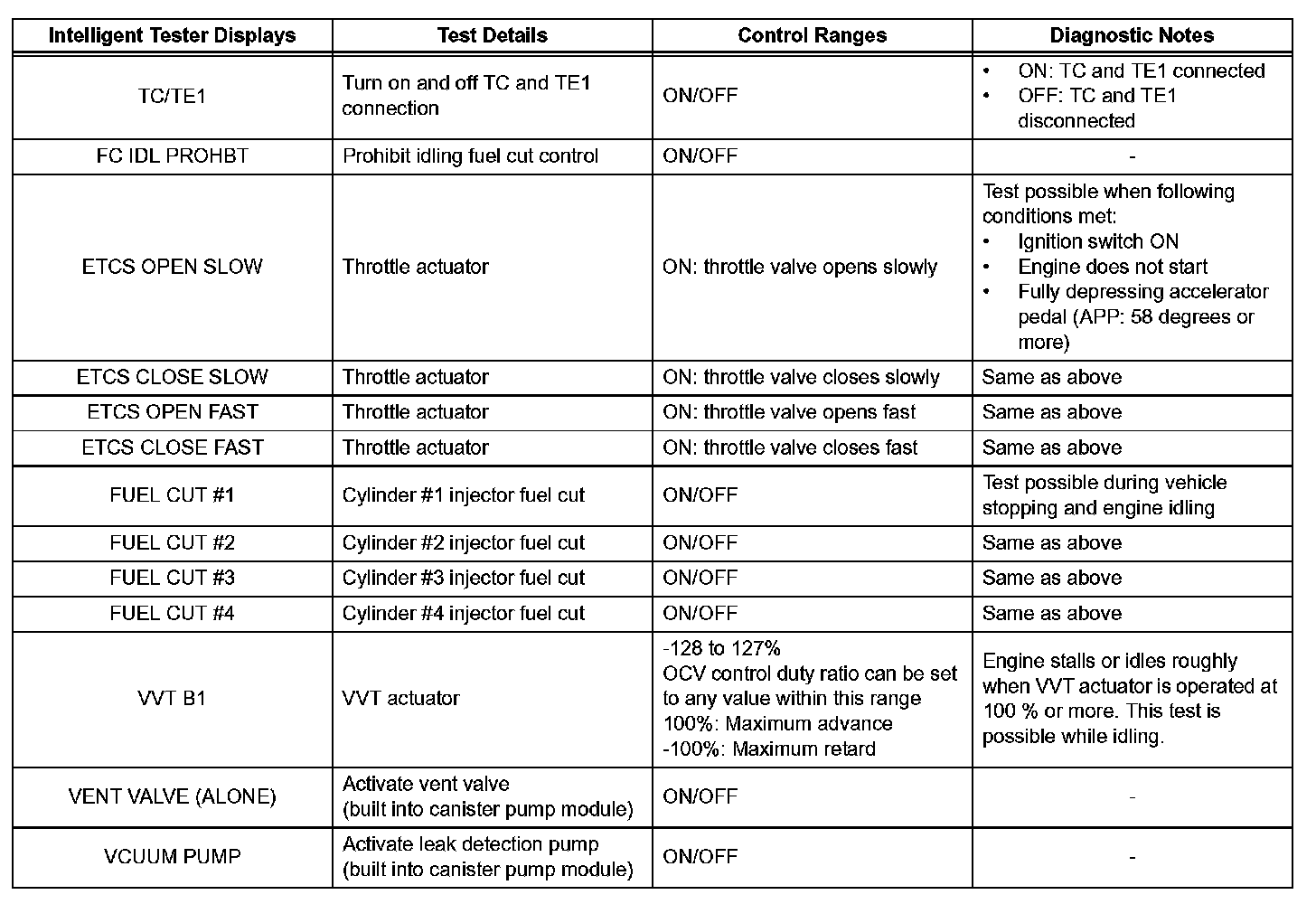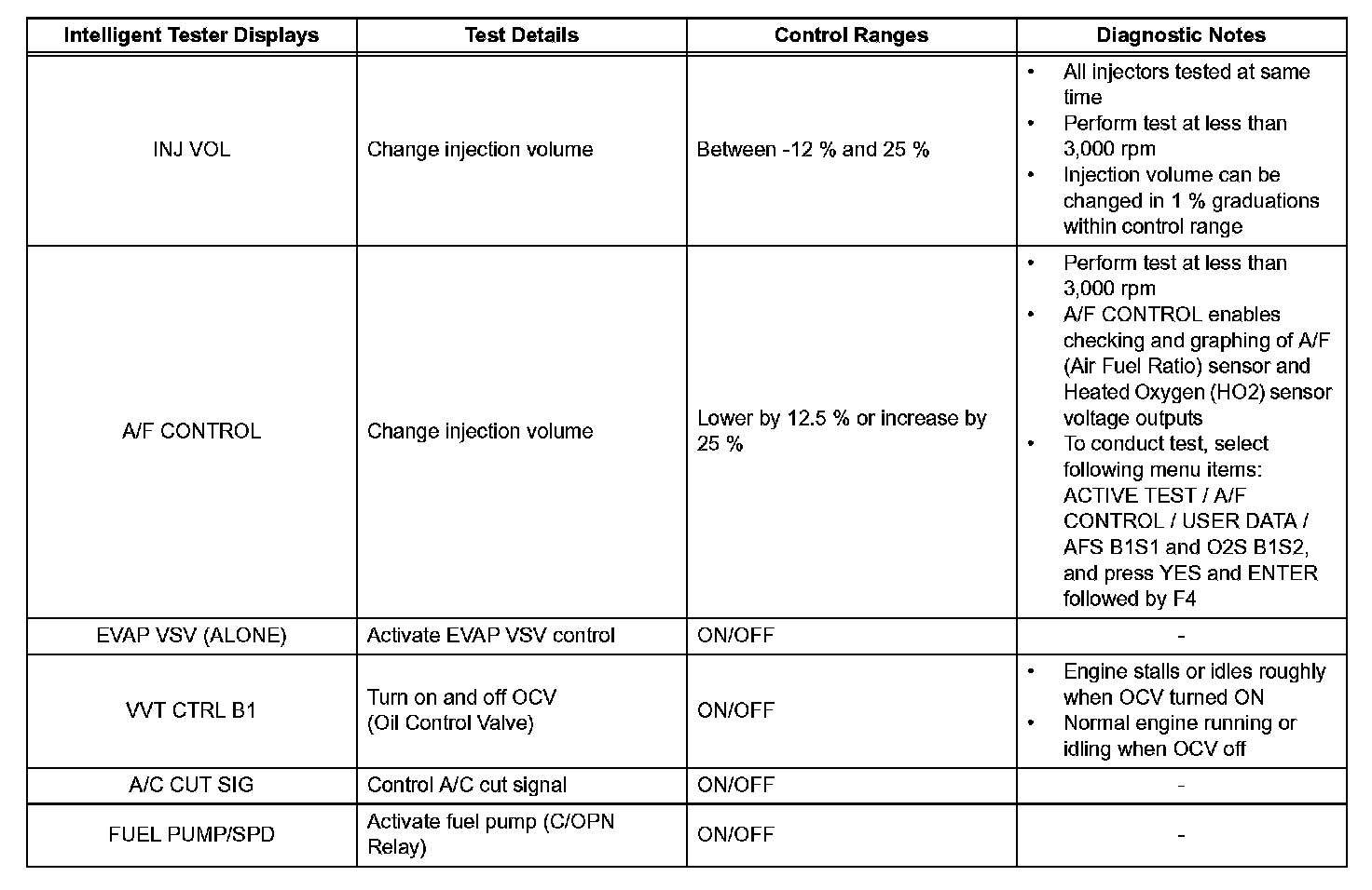 e. Perform the ACTIVE TEST by referring to the table given.