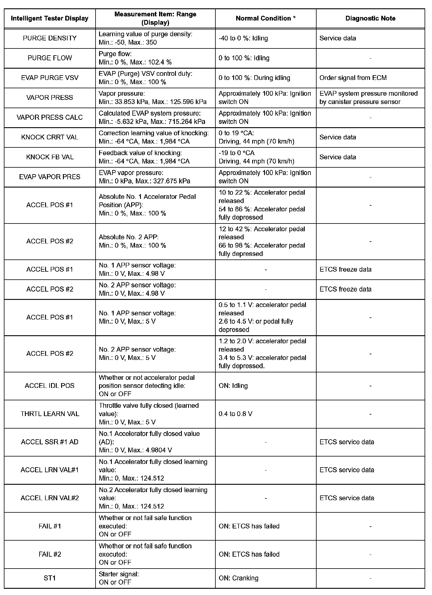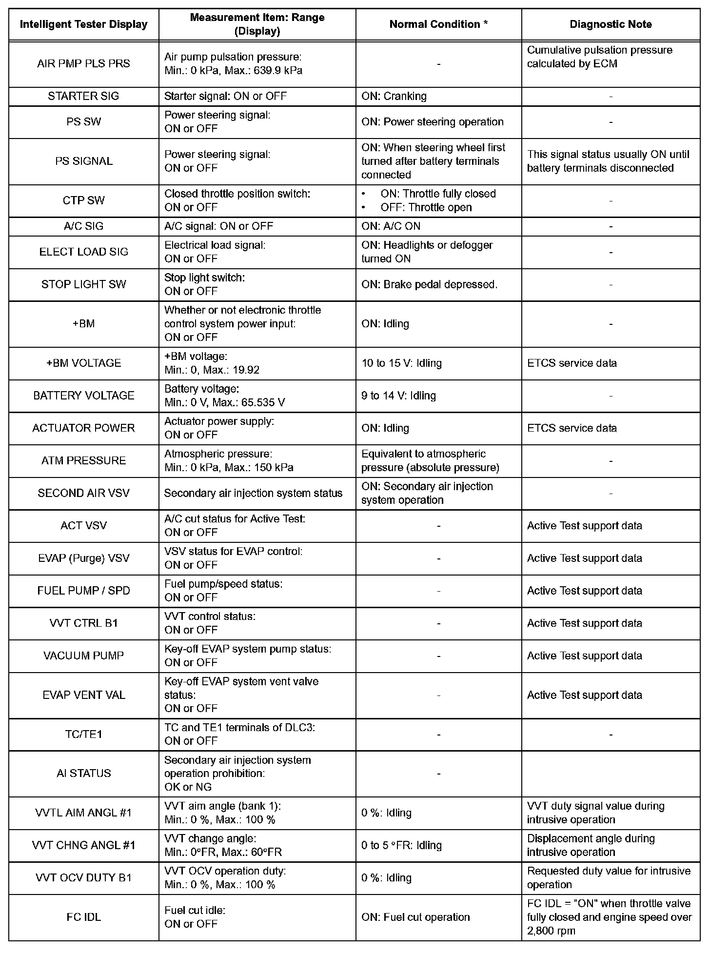 DATA LISTHINT: By reading the DATA LIST displayed on a intelligent tester, you can check values, including those of the switches, sensors, and actuators, without removing any parts. Reading the DATA LIST as the first step of troubleshooting is one method of shortening diagnostic time.
